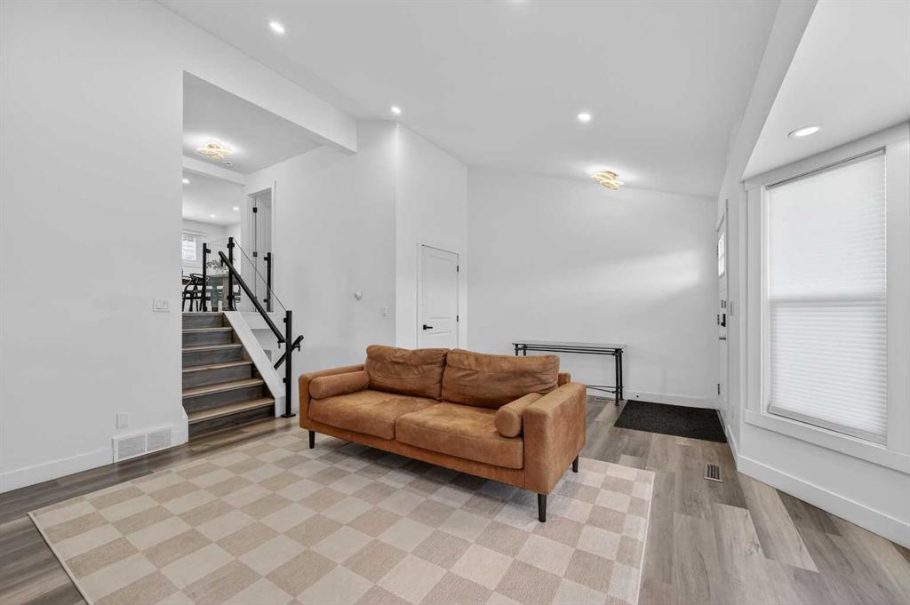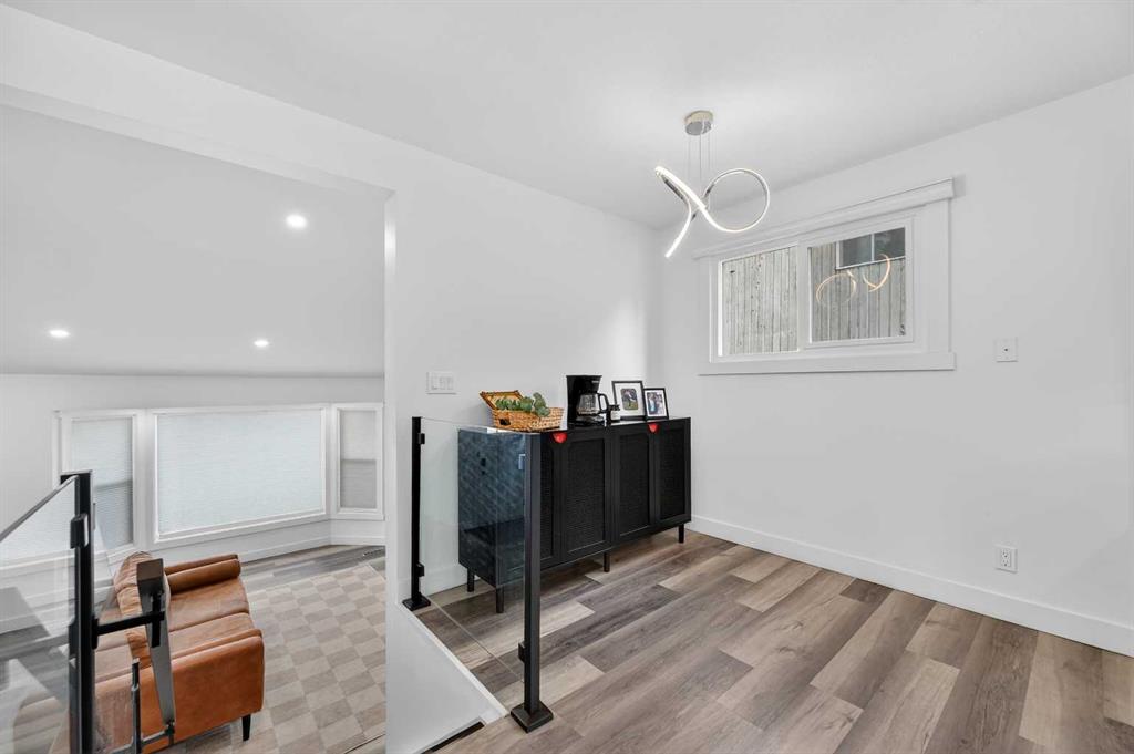 The main level features soaring vaulted ceilings and large windows that fill the space with natural light. The open-concept living and dining area is ideal for entertaining or relaxing at home. Just a few steps up, the elevated kitchen overlooks the living space through sleek glass railings, adding architectural interest and a sense of openness. Complete with stainless steel appliances, quartz countertops, and a large central island, this kitchen is both practical and impressive.