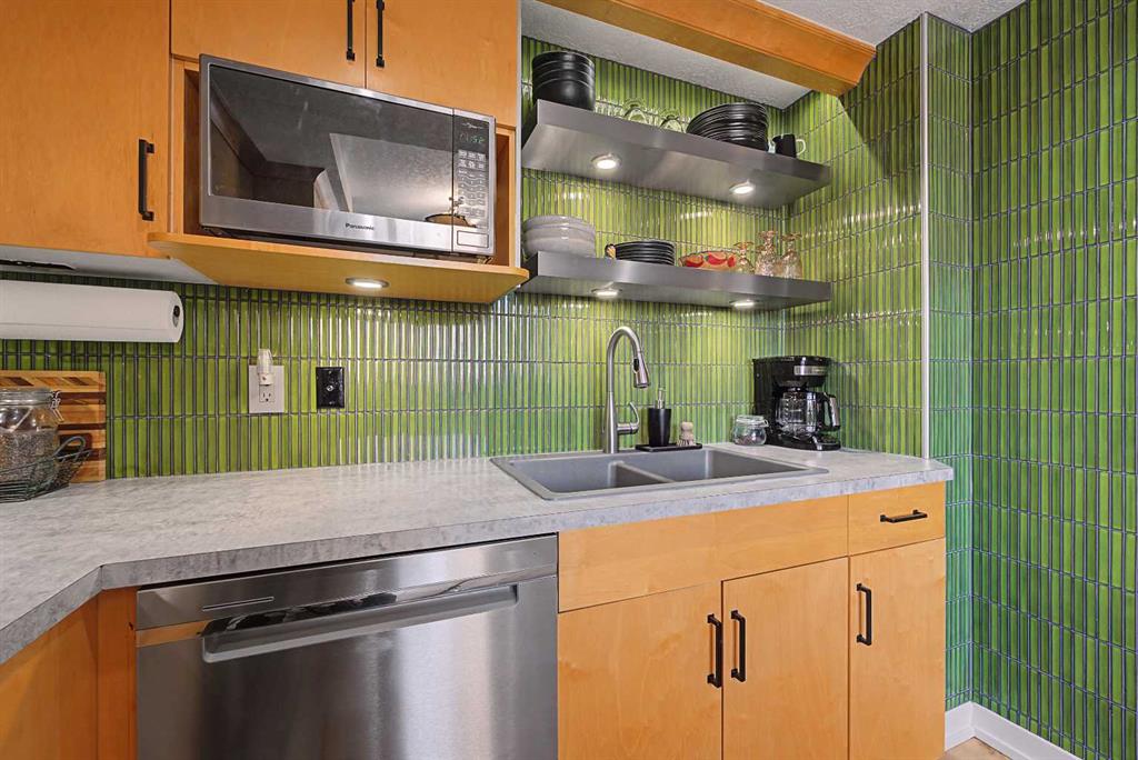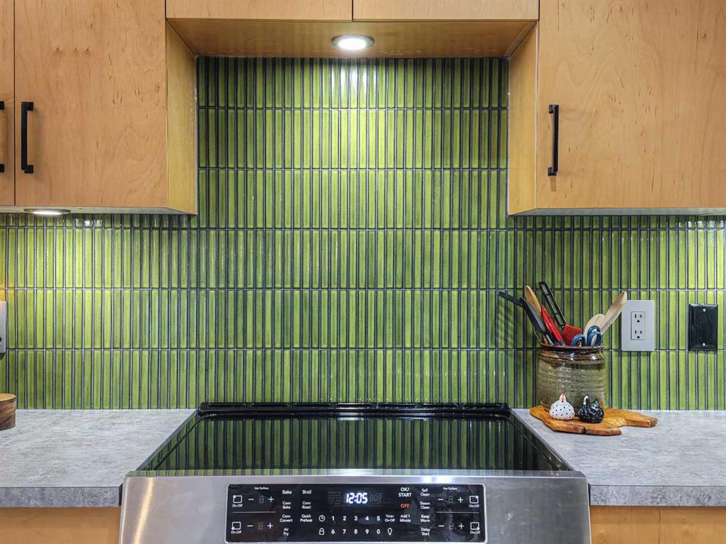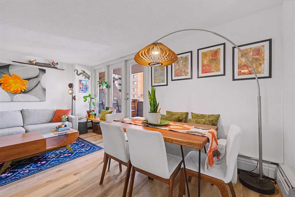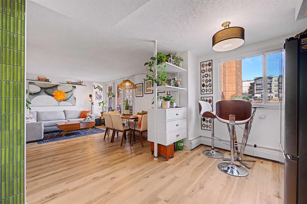 STUNNING 2 BED CORNER UNIT | SOPHISTICATED RENOS | MOVE IN READY: Elevate your lifestyle in this BRIGHT, BEAUTIFUL, 800+ sq ft sanctuary at Monticello Estates. Located just steps from the best RESTAURANTS, and SHOPS on 17th Ave, this move-in-ready home blends URBAN energy with total peace. This isn’t just a condo; it’s a VIBE. Flooded with natural light, this home features a masterfully REDESIGNED kitchen with CUSTOM light-maple cabinetry, sleek matte-black hardware, and a vertical tile backsplash in AVOCADO GREEN; cooking enthusiasts will love the premium full suite of professional-grade stainless steel appliances. You’ll love the STYLISH bathroom, finished with classic white subway tiles for a modern and eclectic feel. Both bedrooms are brimming with light and generously sized to fit a king size bed with room to spare plus the wide-plank floors throughout keep the whole space feeling FRESH AND LIGHT. Follow the OPEN-CONCEPT layout to the spacious living area with a LARGE covered balcony that brings in a ton of light during the day and the sparkling city views at night. Complete with secured parking, a storage locker, Bike storage and in-suite laundry, this upgraded residence offers an UNPARALLELED LIFESTYLE in the heart of the Beltline.