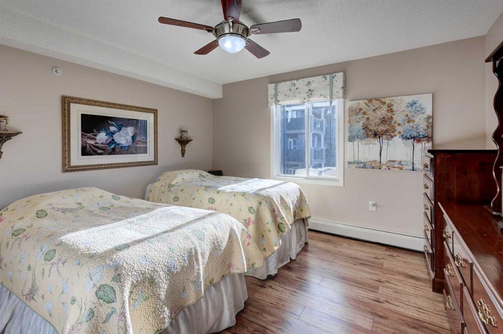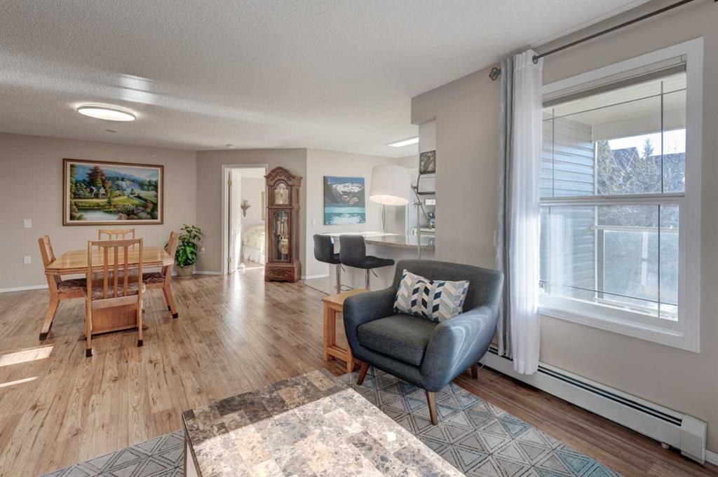 Premium location for this bright, spacious 3rd-floor end unit with no neighbours above! One of the largest units in this well-managed Adult 60+ community, this 2-bedroom, 2-bathroom home offers an excellent open-concept layout with extra South and West facing windows flooding the home with an abundance of natural light. The U-shaped kitchen is generous in size with granite countertops, a large peninsula, white cabinets and pull-outs, and newer stainless-steel appliances. The living and dining areas feature a large open space for added comfort and ambiance, along with electronic blinds and laminate flooring running throughout most of the unit. The primary bedroom includes a private 4-piece ensuite with walk thru closet, while a 3-piece main bath is perfect for guests off the second bedroom. Additional highlights include a large covered balcony, tiled entry, in-suite storage with newer stand-up washer and dryer, jacuzzi tub, towel warmer, quartz bathroom countertops, and a titled heated underground parking stall. Enjoy an exceptionally active and welcoming community or simply relax in the comfort of your own home. Building amenities span multiple floors and include a dining room, Café Bistro, lounge, craft room, exercise room, hair salon, library, guest suite, rooftop, and a carwash. Did I mention a chef Mon-Fri for dinner? Condo fees include heat, water, and electricity. A mandatory $75/month dining fee applies for weekday meals. Public transit is conveniently located directly in front of the complex, with shopping, restaurants, and health services just steps away. The LRT station is adjacent to the complex, making commuting effortless. This impressive unit truly offers comfort, convenience, and community…a must-see!