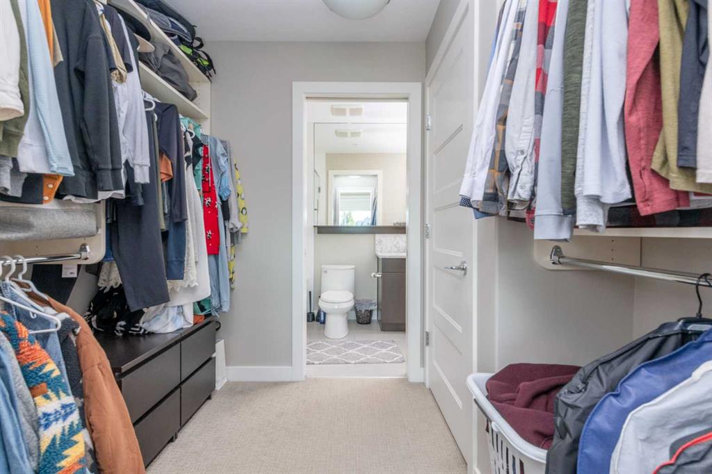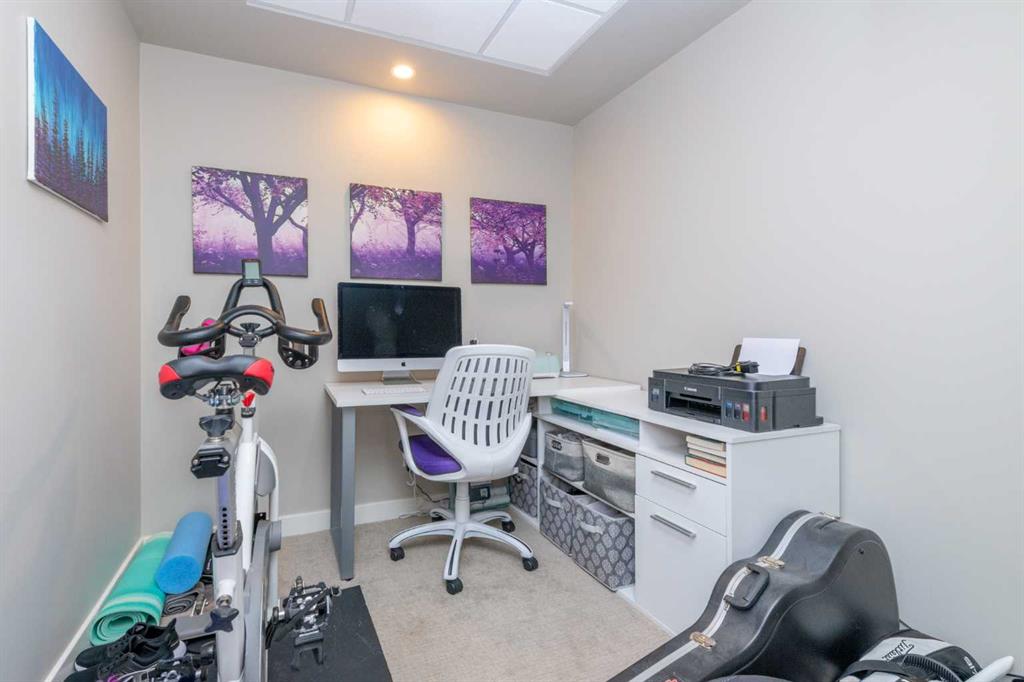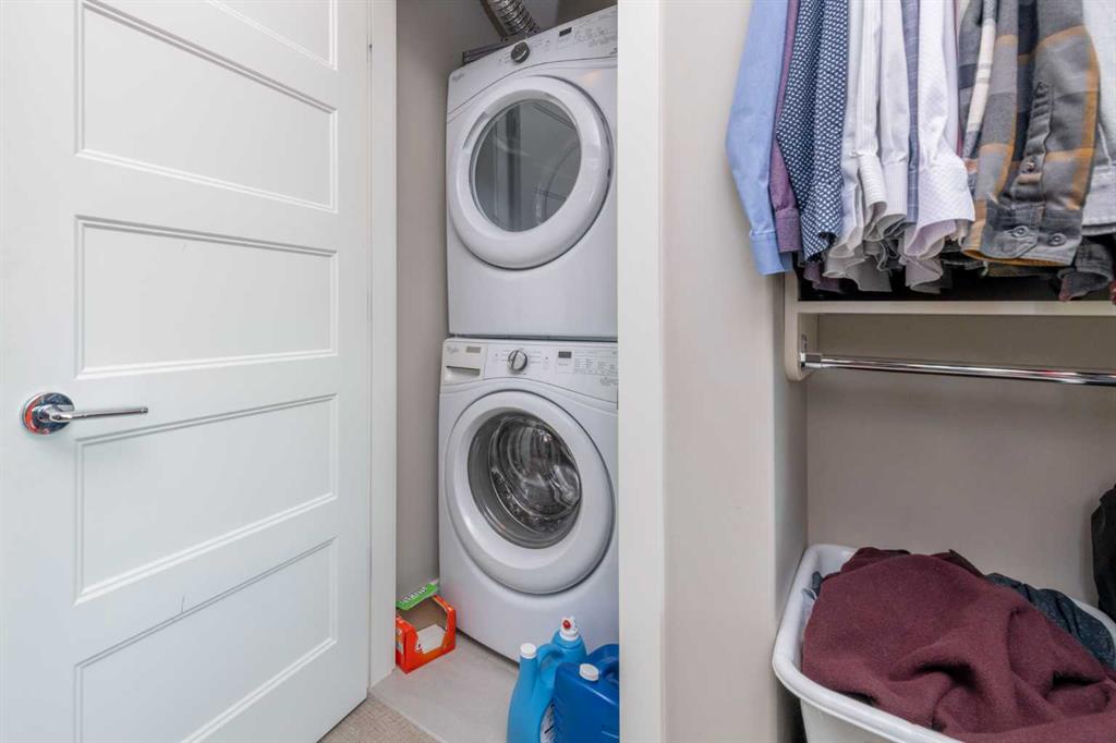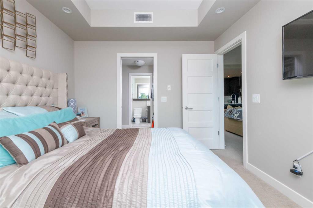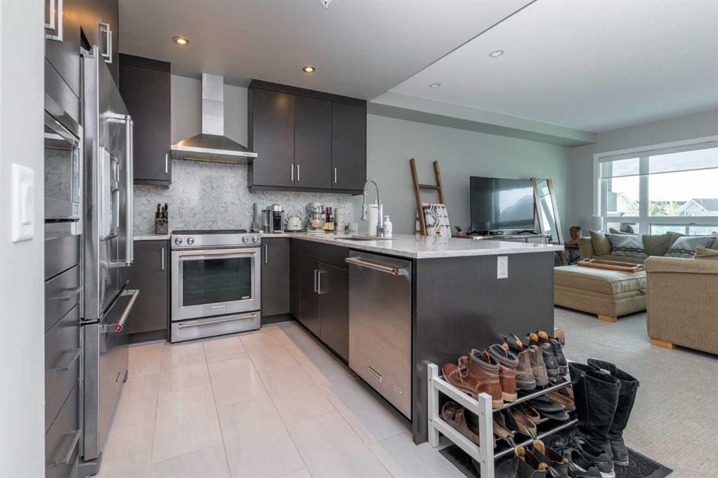 Welcome to The Armory in sought after Currie Barracks. This thoughtfully designed unit is located across from the street from the beautiful gardens by Officers Inn. Offering lots of curb appeal and ample surrounding amenities all within walking distance. Walk into this one bedroom unit with 9 foot ceilings and you instantly notice how big the windows are, allowing the room to fill with natural light. The kitchen is loaded with matching stainless steel Kitchen Aid Range, dishwasher, and a fridge with ice maker and water dispenser. The microwave is built into the cabinets for a more refined look, and the kitchen has a stainless steel under-mounted sink encased by a matching quartz countertop and backsplash. In suite laundry in the walkthrough closet allowing maximum convenience. Pantry closet with shelves, and a large den perfect for a home office. The bathroom is equipped with quartz countertops and a long one piece vanity mirror and soaker tub. Central Air Conditioning allowing maximum comfort all year round. Covered balcony with courtyard views allowing more additional space that is functional year round. Titled parking space/storage locker, and is located in a prime location.