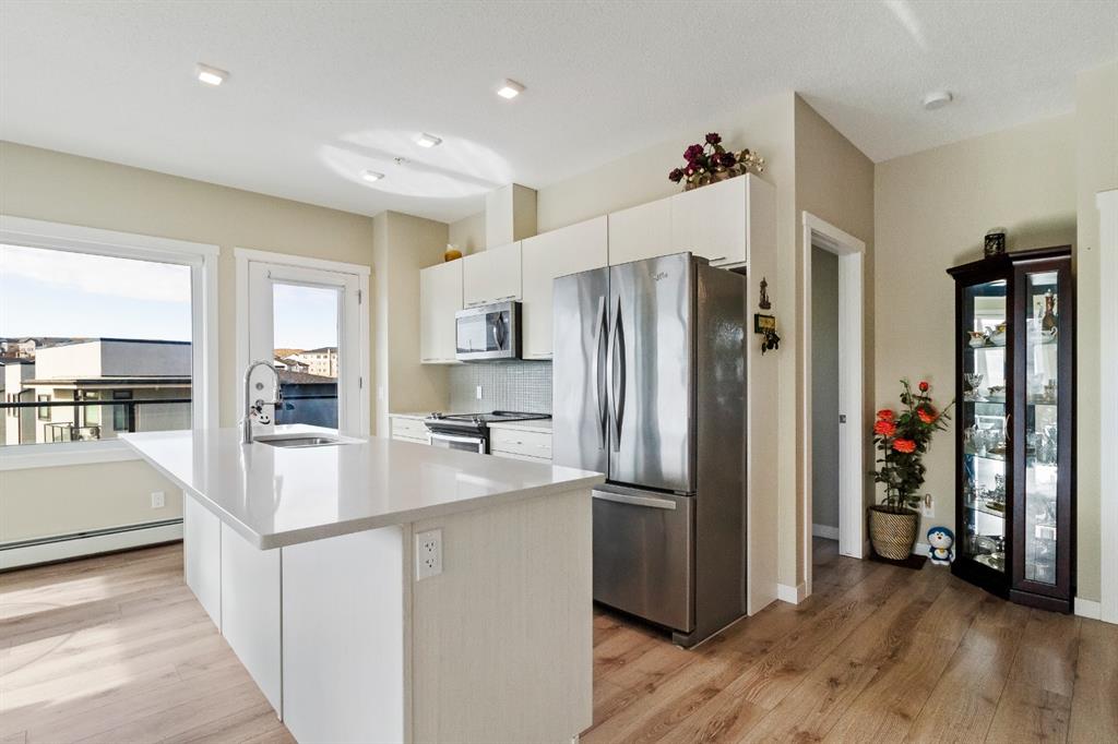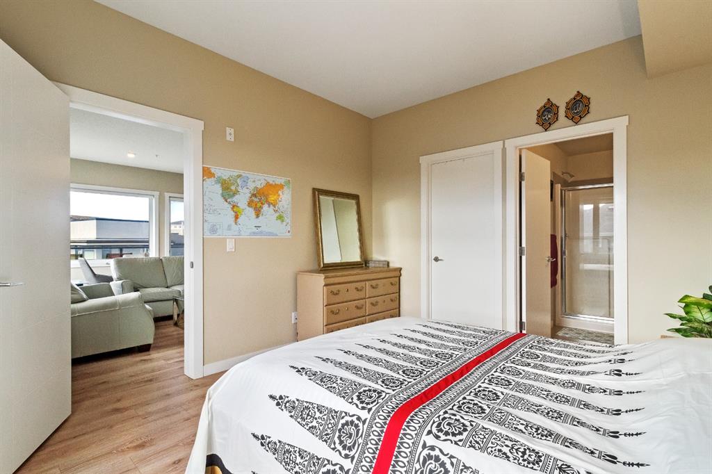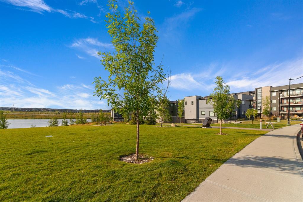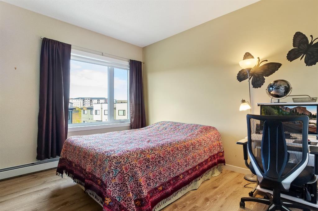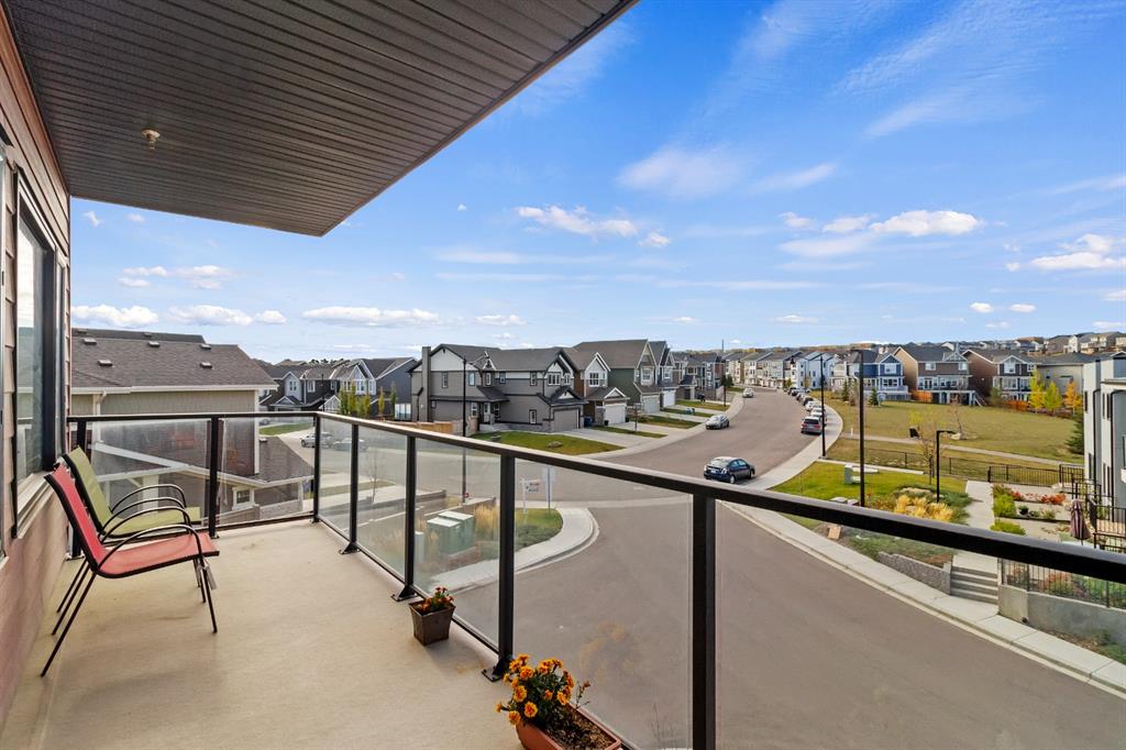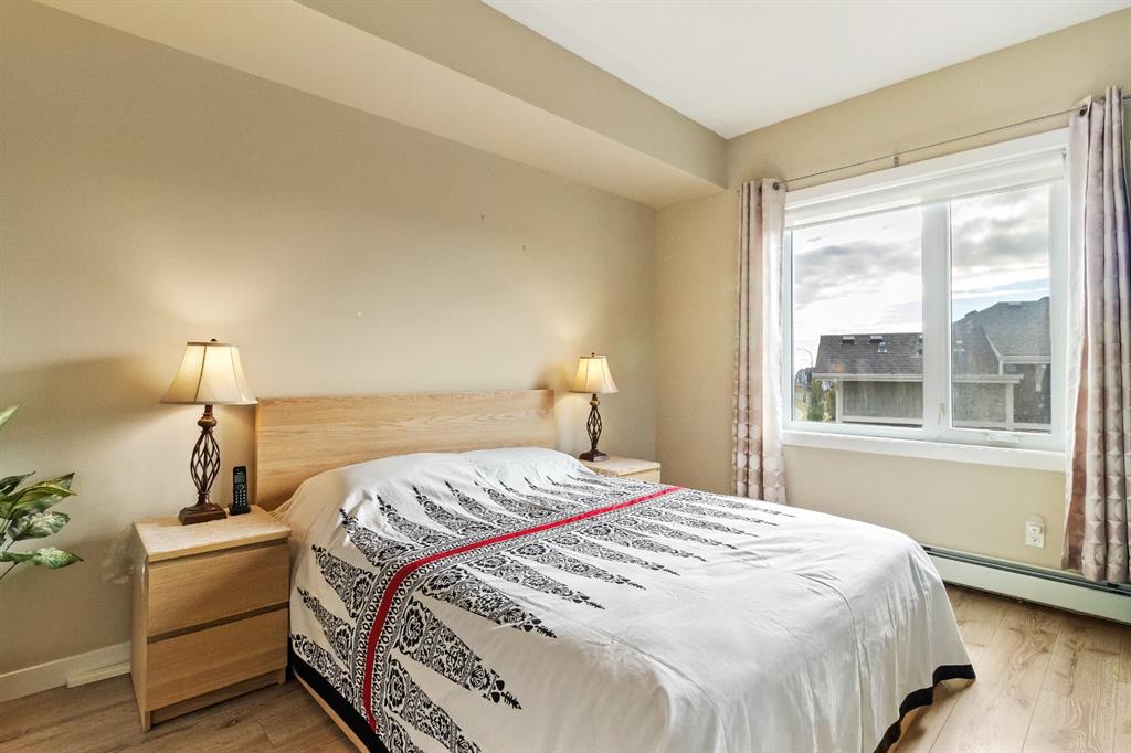 This beautiful and spacious 2 bedroom, CORNER UNIT condo features 9′ ceilings, 23′ private balcony, and VIEWS of the park! The open concept living area combines the spacious kitchen with detached island, dining room and living room with beautiful corner southwest facing windows. The owner’s suite, which can easily fit a king sized bed, features a sizeable walk in closet and private ensuite. To complete this beautiful home there is a large 2nd bedroom and ample storage in the in-suite storage room. There are no carpets in this unit as laminate floors throughout was the builder upgrade. The biggest difference this building has to offer is it is a one apartment building development meaning less dense compared to others which have 3+ buildings. Also, great location with easy access to Stoney Trail and close to Walmart, Costco, Good Life and many other shops and restaurants!
