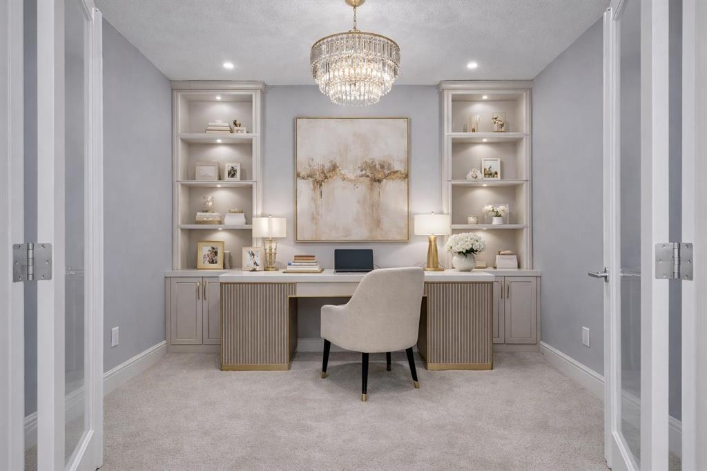 The main floor showcases gleaming tile and Brazilian hardwood flooring, a versatile formal room, and a private office with French doors. The heart of the home is a beautifully designed two-tone chef’s kitchen with granite countertops, high-end built-in appliances, and a large island overlooking the inviting family room with a modern fireplace. A bright breakfast nook leads to a spacious deck—perfect for summer living.