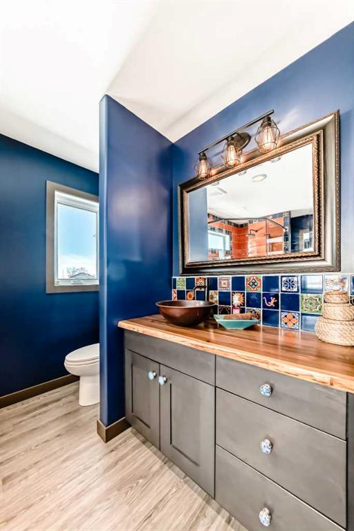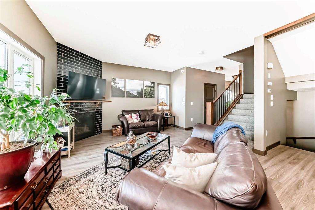 backyard—perfect for gatherings—while the cozy living room features a gas fireplace for relaxing evenings. A convenient two-piece bath and access to the double attached garage complete the main floor. Upstairs, is the generous primary suite/walk-in closet and a