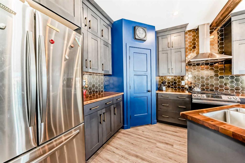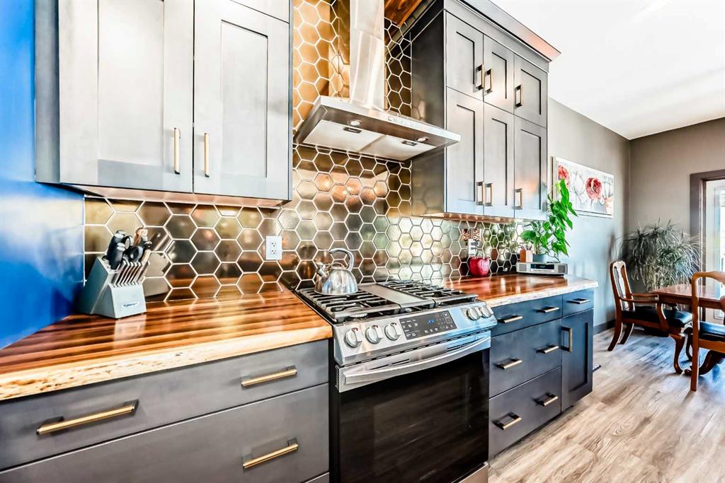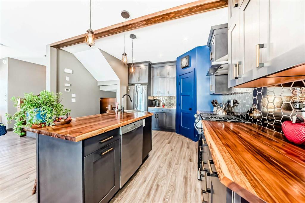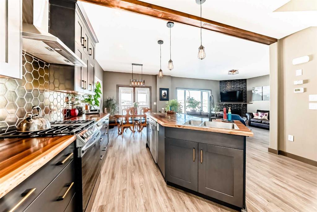 sq. ft. of inviting living space, the open-concept layout features durable vinyl flooring and central air conditioning for year-round comfort. From the moment you arrive, the attractive curb appeal and nicely landscaped yard make a lasting impression. Step into the spacious front entry and immediately notice the stylish décor & attention to detail. The upscale kitchen is a true highlight, complete with rich dark-stained maple cabinetry, stunning butcher block countertops, a large island with sink and eating bar, corner pantry, gas stove, and plenty of room for cooking and entertaining. The dining area opens onto a covered pergola deck in the