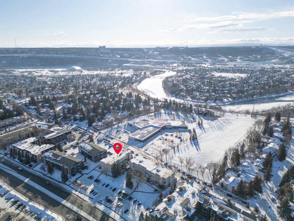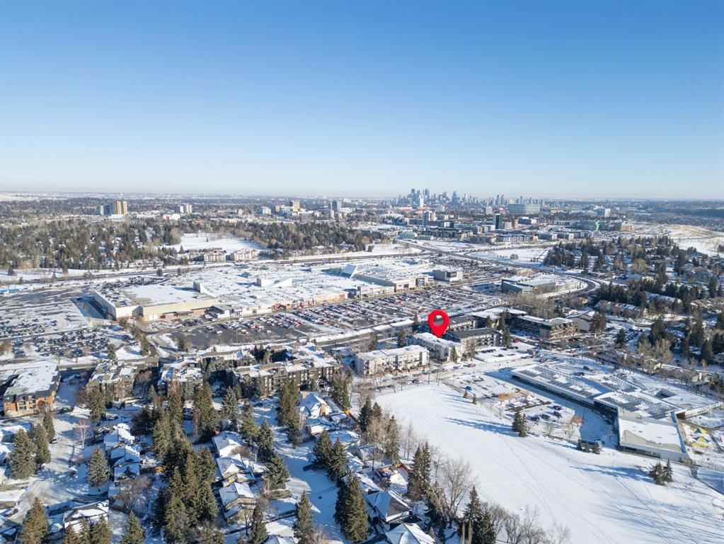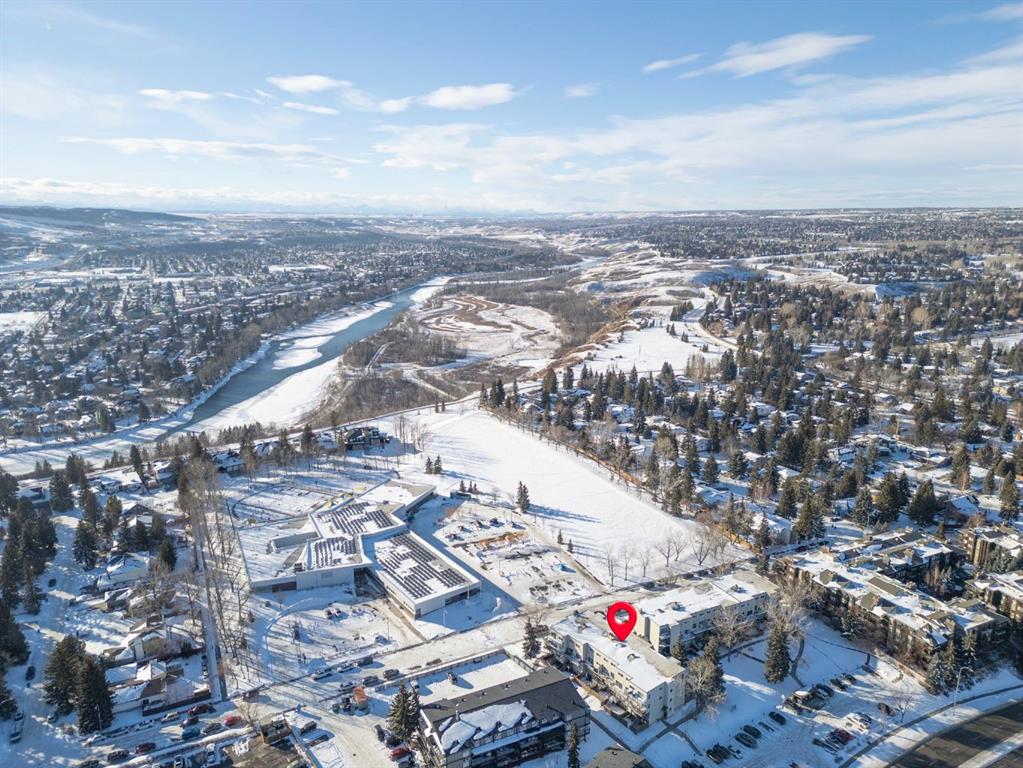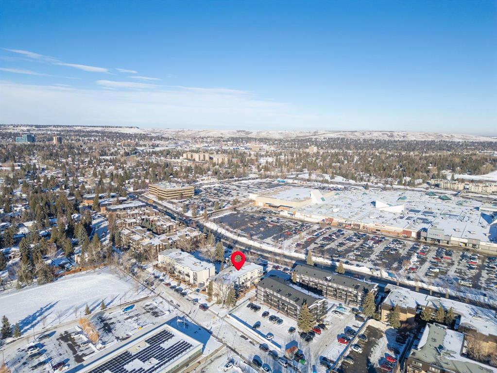 TOP FLOOR. SUN-FILLED. WALK EVERYWHERE. LOCATION LOCATION LOCATION!!! Market Mall is ACROSS the Street = groceries, shops, restaurants, services, coffee shops, theatres. 5 minute drive to U of C or walk in 25 minutes or 2 minute walk to bus stop = arrival at U of C in 10 minutes! Bow River Pathway is a block away – extensive, year-round paved and multi-use trails for walking, running and cycling! Rare opportunity to own in this quiet, well-kept building. NO sales have occurred here since 2024 – makes this a great opportunity to find the perfect place to live – and a solid stable community to live in. This BRIGHT – CORNER 1-bedroom, 1-bathroom unit sits on the TOP floor, meaning no one above you. Exceptional East-South-West natural light throughout the day. Enjoy a large private SOUTH facing balcony off the living room, unobstructed sunshine into both the open concept living/dining space and the bedroom. PLUS enjoy mountain views from your kitchen window! The layout offers generous in-suite storage (bikes, boxes, or use as pocket office area) and ample closet space. IN SUITE LAUNDRY. This unit is VACANT and move-in ready. LOW condo fees that include assigned PARKING, HEAT & WATER – keep ownership affordable. This is an exceptional opportunity for a first-time buyer, someone looking for a quiet haven in the city or an investor ( NO Short Term rentals under 28 days allowed. ) Have a PET?! Board approval necessary but no weight, breed, size restrictions. Own for less than many rental payments – while building equity in one of Calgary’s most connected communities! Quiet building. Top floor privacy. Sunshine all day. Location that works for real life. Faces Christine Meikle School – so many days/months of the year – you have no neighbours! Plus the road is blocked right in front of this unit (can’t drive straight thru on 50 St) – so LIMITED traffic noise below! Perfect QUIET space to study or relax. Varsity gives you inner-city access without inner-city chaos! Close to major roadways. Airport is 25 mins away and drive Downtown in 10 mins (without traffic of course!) Get out of the city quickly – Canmore is an hour away! Mature trees, strong schools, walkability and long-term value. Varisty is one of Calgary’s most popular communities. Some photos are virtually staged. Call today to view – or book a showing!
