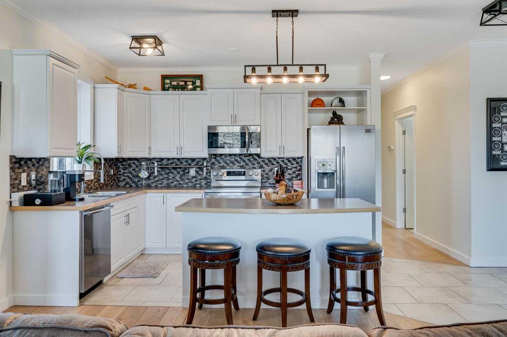 Welcome to Unit 303 at 29 N Railway Street in the heart of Okotoks. This top-floor, 1,128 sq ft condo offers a bright and functional layout with 2 bedrooms and 2 full bathrooms, perfect for comfortable everyday living. Enjoy the privacy and quiet of a north-facing balcony, ideal for morning coffee or unwinding at the end of the day. The open-concept living and dining area is spacious and inviting, complemented by in-suite laundry and plenty of storage throughout. The primary bedroom features a generous layout with its own ensuite, while the second bedroom and bathroom provide flexibility for guests, a home office, or roommates. An assigned parking stall adds everyday convenience. Located just steps from downtown Okotoks, shops, restaurants, walking paths, and amenities, this well-maintained building offers unbeatable walkability and lifestyle appeal. A fantastic opportunity for first-time buyers, downsizers, or investors alike. Pet friendly up to 50kg with board approval. Adult Building 21+