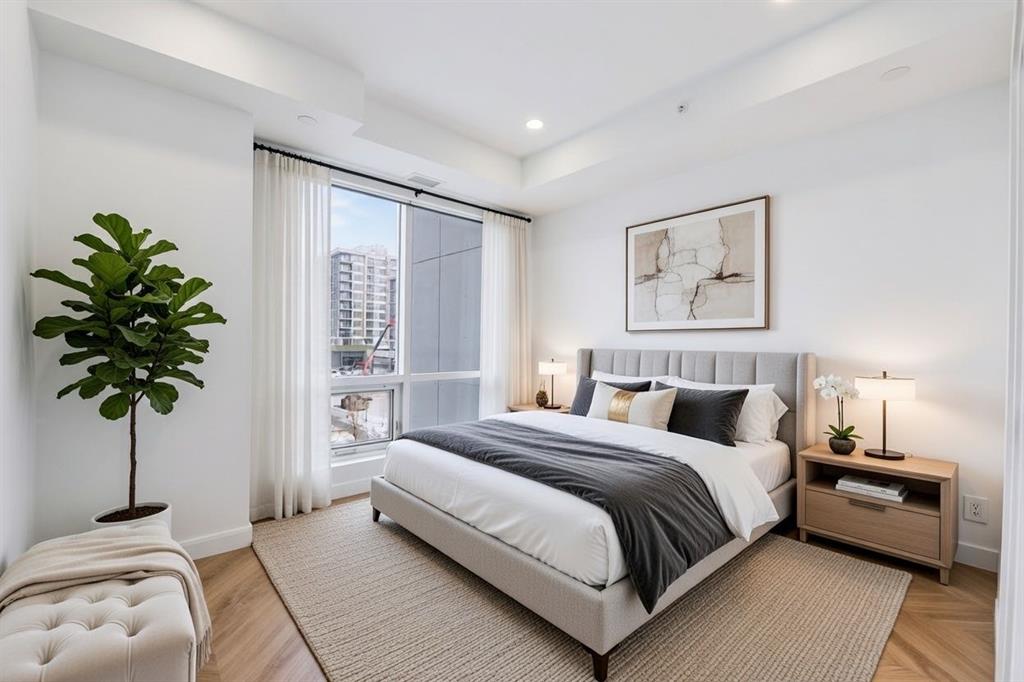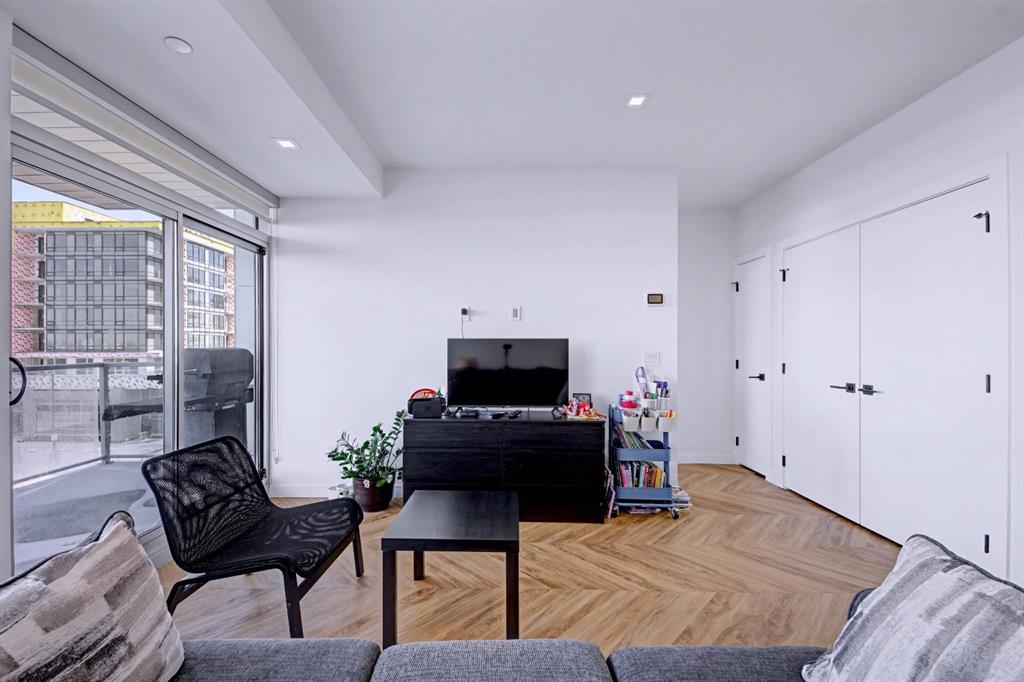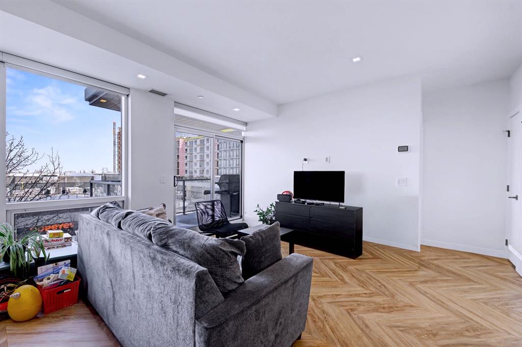 Expansive windows and a large sliding patio door flood the space with natural light while showcasing Calgary’s iconic big sky views. Step outside to a generously sized balcony with ample room for outdoor seating and dining, perfect for relaxing or entertaining.