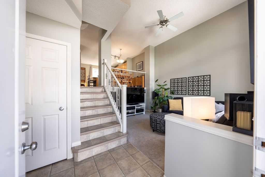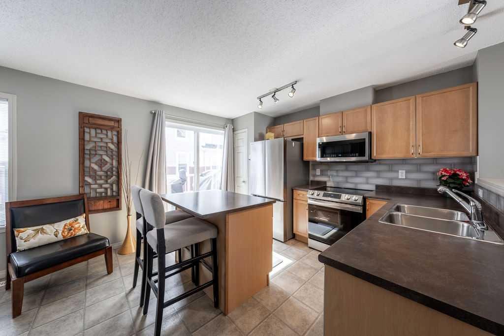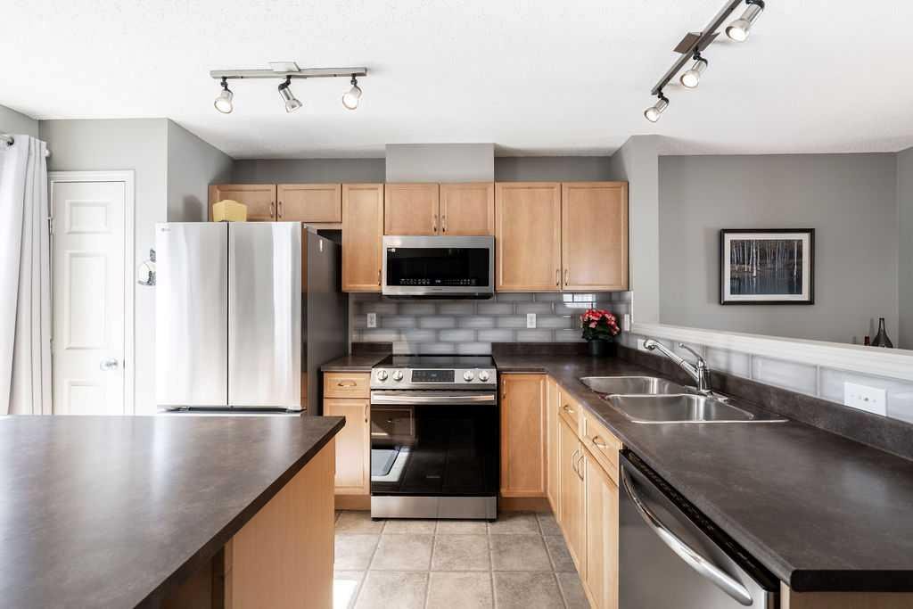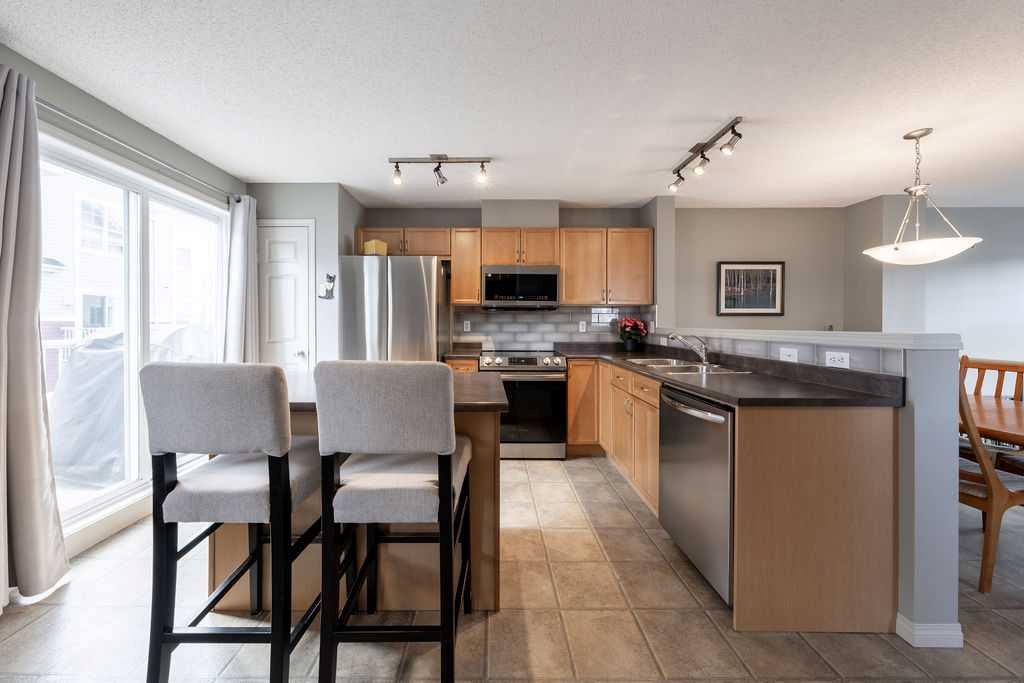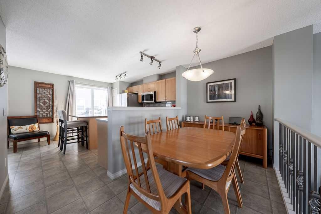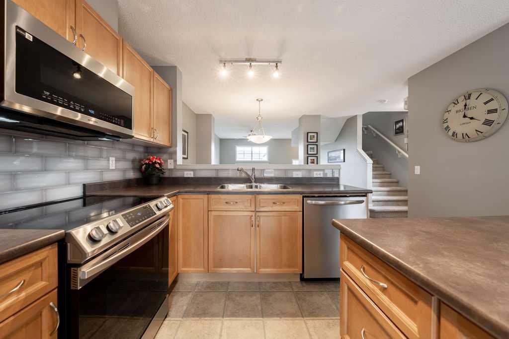 PRIME LOCATION !!! Nestled into a quiet and safe placement within the complex, this END UNIT townhome has been meticulously maintained over the years. The charming FENCED FRONT YARD welcomes you as you walk up to the entrance. Inside you will be greeted with expansive ceilings, natural light , and a warm sense of “home”. The front living room provides plenty of space to nestle in and enjoy movie nights, while still having privacy from the large windows that face away from the complex. Up a few stairs to the main living area, you will be pleasantly surprised how much space the dining and kitchen has to offer. The well appointed kitchen has had some updates over the years including Fridge (2026) , microwave (2024) , dishwasher (2022) and stove (2021). PLUS the stunning built in cabinetry and workspace to complete the nook area. This is a true bonus you wont find in other units, and adds to the function of this floorplan. Plenty of cabinets and counterspace in this pristine kitchen will make meal times a breeze. The 2 piece bathroom is conveniently tucked away for privacy. The upper level boasts 2 LARGE PRIMARY SUITES, both with 4 piece ensuites and walk in closets !! Plenty of natural light graces this upper level with the addition of extra windows that come with being in an end unit. The upper flex space provides some built in storage, and an area for a home office, a work out space, or a small reading nook. Need storage? This home has an unfinished basement that is the perfect extra space for crafting , play space, hobby room , or just a large area to do your laundry. The DOUBLE ATTACHED GARAGE is icing on the cake. Its rare to find a perfect mixture of pride of ownership, living space, views from almost every window, a yard to garden or let the kids and pets play in , visitor parking right outside your door, and indoor space to park 2 cars at this price!! New Brighton is widely considered one of Calgary’s more family friendly neighborhoods with excellent recreation amenities including a splash park , outdoor hockey rink, tennis and pickleball courts, playgrounds, basketball courts and more! This is not just a home choice- its a perfect lifestyle adjustment! Book your appointment to view!