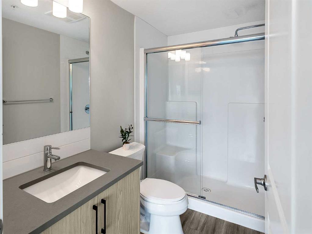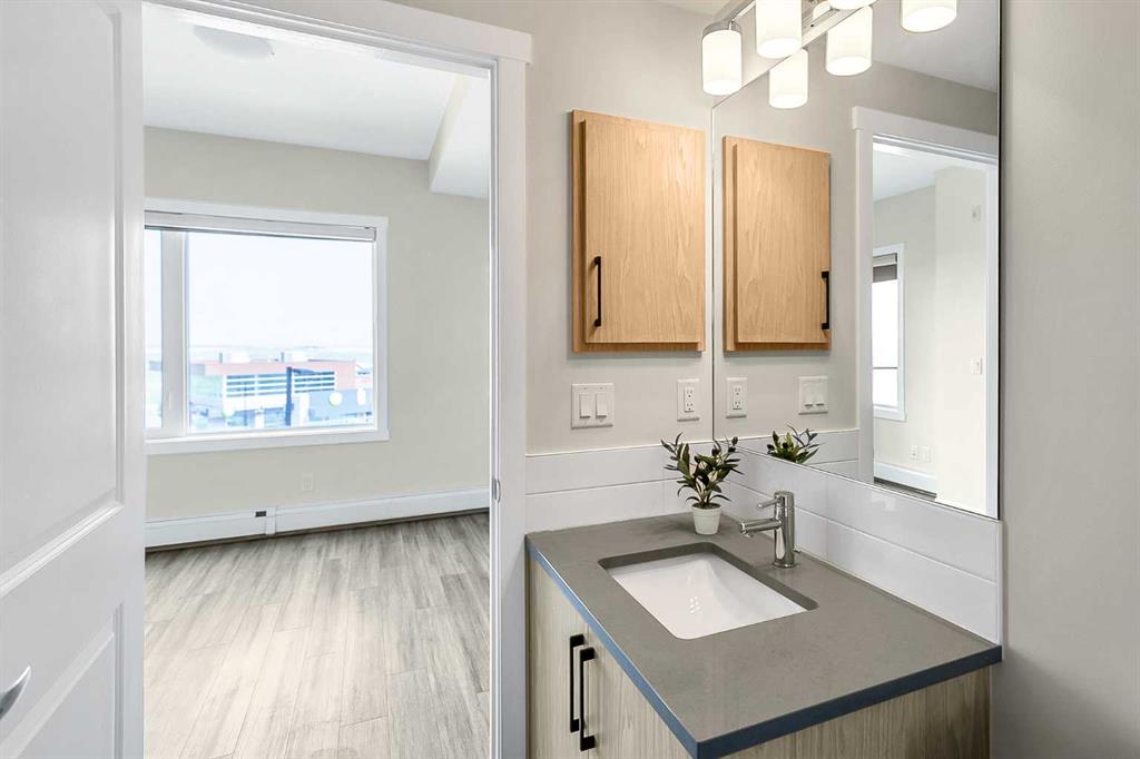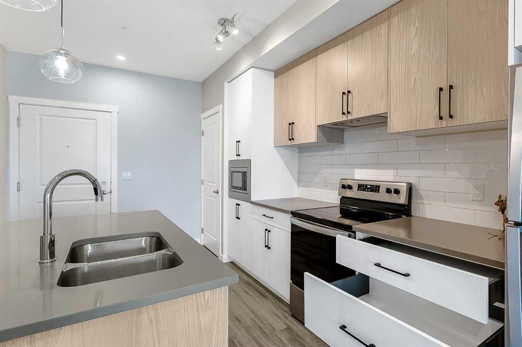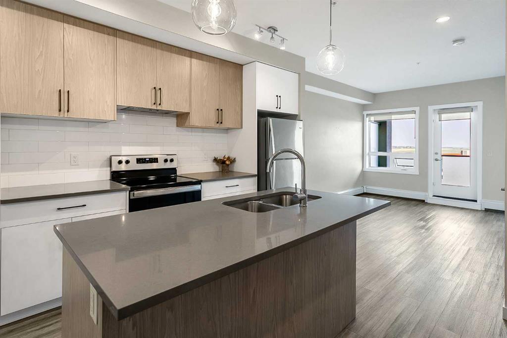 Lovely two bedroom apartment located in the Q2 building of Sage Hill Quarters. The location is second to none for convenience – walk to groceries, dining, child care, drug stores, just to name a few. This apartment condo features two bedrooms, two full bathrooms, plenty of living space, underground parking and titled storage. The east facing balcony is private and floods the apartment with early morning sun. The end unit is situated close to the elevators for easy access and with the stairwell on the south side only shares one common wall. Modern fixtures and finishings give the apartment an open airy feeling. Light, bright and inviting kitchen features plenty to storage space, soft close cabinets and quartz countertops for easy maintenance. The primary bedroom features huge windows, a large walk in closet, and a private ensuite. The secondary bedroom is large with a closet for extra storage and easy access to the fully appointed main bathroom. Plenty of living space will make this condo a cozy, beautiful space to live. Sage Hill is close to the airport and easy access main feeder roads make this location a fantastic option.