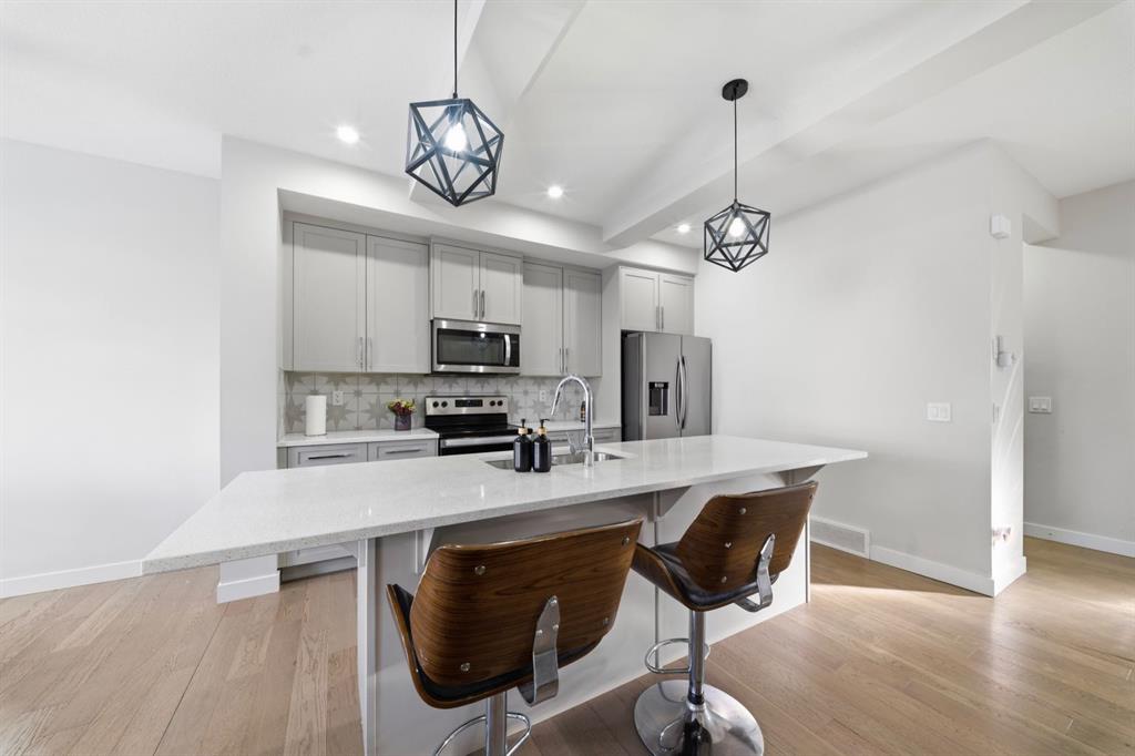 The main floor features engineered hardwood flooring, a bright open layout, a convenient half bath and a beautifully designed kitchen centered around a large quartz island that comfortably seats up to six, making it the true heart of the home for everyday living and entertaining. A cozy electric fireplace, oversized windows and upgraded light fixtures add warmth and character throughout.