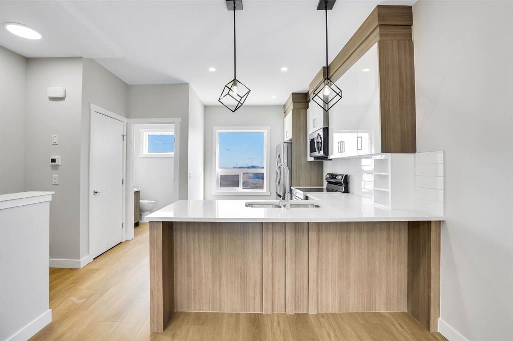 Welcome to this beautifully upgraded corner unit townhouse in the desirable community of Redstone! This stunning 3 bed, 3.5 bath home offers an exceptional layout with thoughtful design throughout. As you enter, you’re greeted by a spacious foyer leading to a main level bedroom with a full ensuite ideal for guests, extended family, or a private office space. You’ll also find access to the attached garage and a separate rear entrance for added convenience. The second floor boasts an open-concept layout featuring a stylish kitchen with stainless steel appliances, a large island perfect for bar stools, and a bright living/dining area that opens onto a private balcony perfect for summer BBQs. A 2-pc bathroom is also conveniently located on this level. Upstairs, enjoy upgraded railings, a dedicated laundry room, and a spacious hallway. The primary bedroom offers a walk-in closet and a full ensuite, while the generously sized second bedroom also features its own private ensuite perfect for added comfort and privacy. Located minutes from Stoney Trail, shopping, parks, and more, this turn key corner unit is the perfect place to call home. Don’t miss out, this one won’t last!