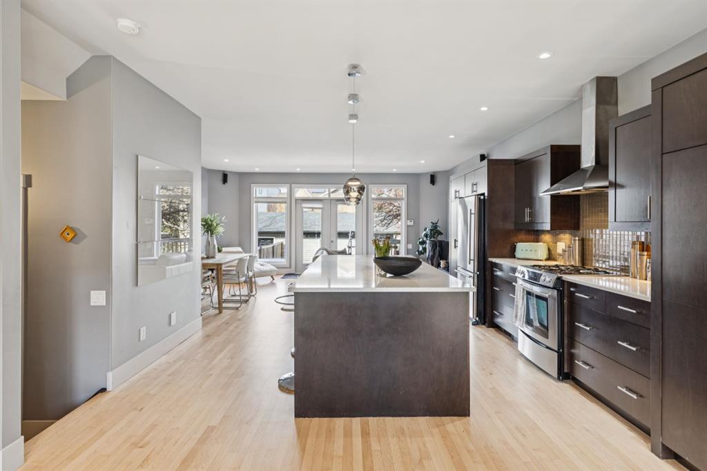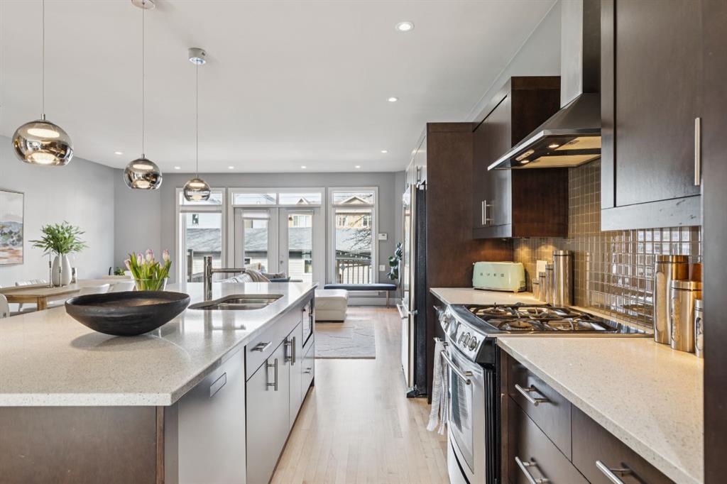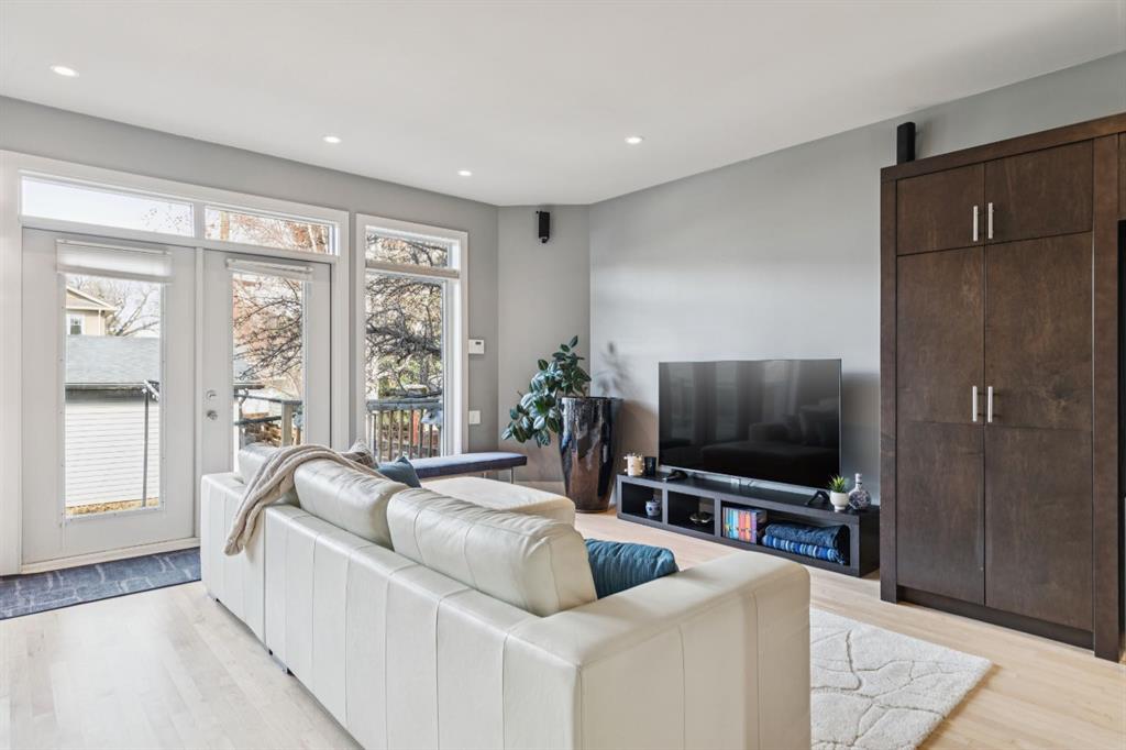 The dining and living areas open through west-facing double doors to the sunny backyard and two-tier deck, creating the perfect indoor-outdoor connection. The yard is complemented by a detached double garage. In 2025 the back lane was paved.