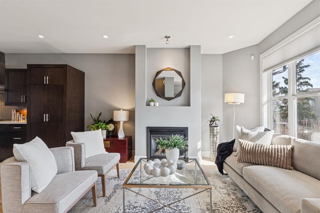 At the heart of the home is the gourmet kitchen, featuring quartz countertops, a large island with stylish new pendant lighting, abundant cabinetry, stainless steel appliances including a gas range and new dishwasher, pantry storage, and under-cabinet lighting. The adjacent sitting area offers plenty of space to relax, highlighted by a cozy gas fireplace.