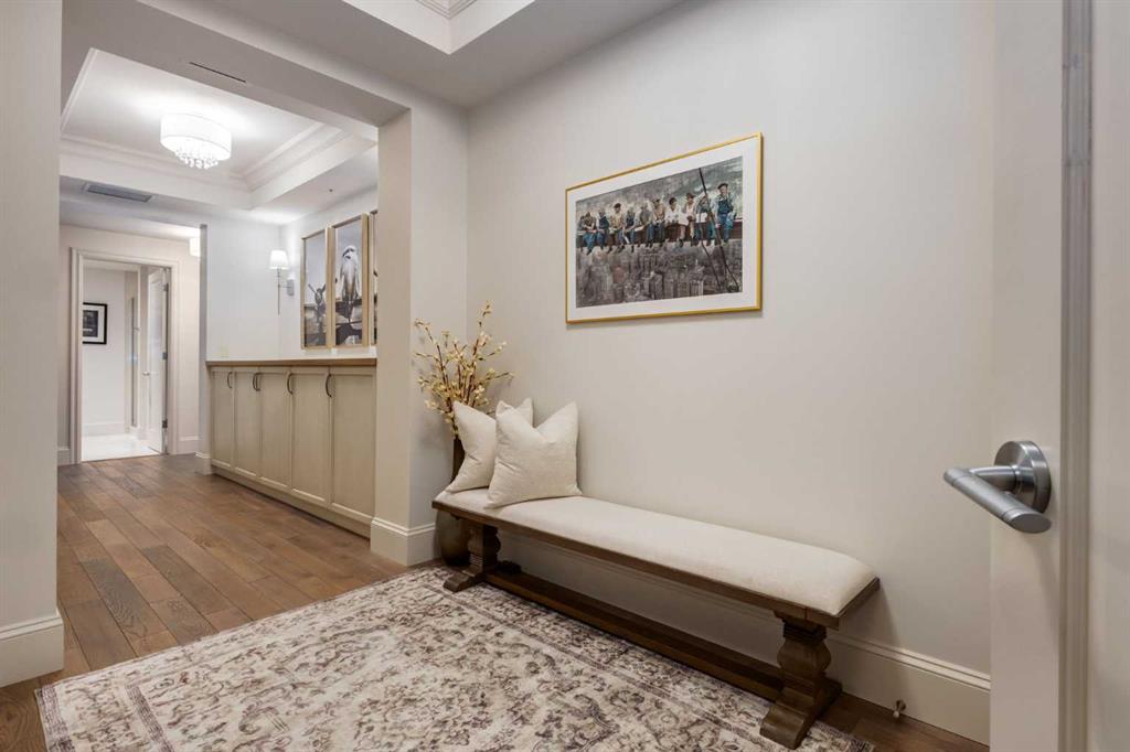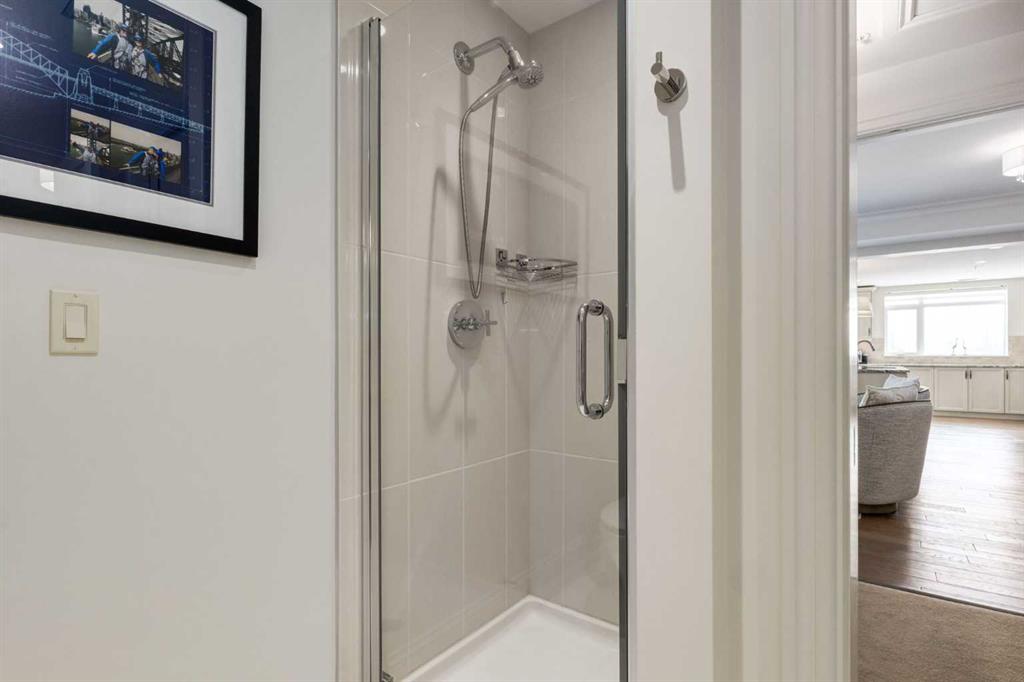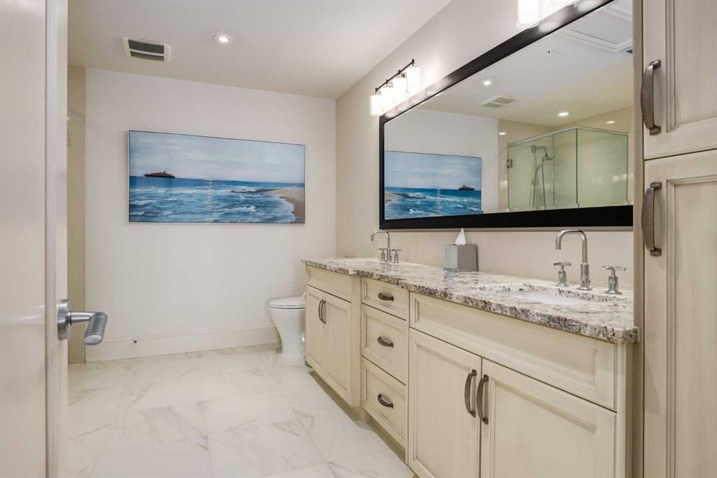 For some, luxury is an occasional indulgence. For others, it is a way of life. If every day luxury & refined living are what you desire, look no further than this outstanding CORNER suite at Champagne in Quarry Park. Offering 1631 SF of impeccably curated living space, with 9-foot ceilings that are flooded with natural light & serene tree top views. Every detail has been thoughtfully considered & the spacious floor plan is sure to delight. A gracious front entrance welcomes you into the suite, & offers a walk-in closet and custom built in cabinetry for your storage needs. The spacious living area with hardwood flooring throughout is sure to delight – a cozy fireplace surrounded by built-ins anchors the living room, sunny & bright dining area with windows on 2 sides is ready to host your family gatherings and provides patio door access to the east facing balcony. The show-stopping kitchen is a chefs dream – expansive island & granite counters, full tile backsplash, luxurious stainless steel appliances including a gas stove & new LG fridge with water/ice dispenser, and an abundance of cabinets providing ample storage including wire pull out racks – so convenient! The serene primary retreat is generously proportioned & offers space for a king-sized bedroom suite & sitting area, while the 5 piece ensuite bath delivers a spa-like experience worthy of a luxury hotel – featuring a relaxing soaking tub, separate shower, granite counters & dual sinks. The walk in closet features a new custom closet system. Second bedroom, equally well-appointed, provides dual aspect windows with beautiful river views & a 3 piece ensuite bath. Additional features include coffered ceilings, estate millwork, solid core doors, new LG wash/dryer tower with steam function, new composite decking installed on the balcony, new carpet in both bedrooms, Hunter Douglas blinds throughout (black out blinds in the bedrooms), custom drapery in this non-smoking, pet-free home. TWO titled, side by side underground parking stalls are included, located very close to the elevator, a rare & valuable convenience. Also included is a titled storage locker on the same level as the parking spots. You’ll appreciate the peace of mind that comes with Champagne’s reputation for exceptional maintenance & inherently quiet concrete construction. Additional building features include 2 car wash bays, bicycle storage, plenty of visitor parking & a peaceful courtyard. Plus it’s pet friending – 2 dogs or cats or combo of both, with board approval. The location can’t be beat! Walk to Carburn Park, nestled on the banks of the Bow River, The Market at Quarry Park offers great amenities including Starbucks, The Park and Original Joe’s restaurants & Co-Op grocery, the Remington YMCA is just around the corner and of course the extensive river pathway system is just outside your door. Easy access to major traffic routes and numerous SE Calgary amenities. This unit shows like new and must be viewed in person to be fully appreciated!
