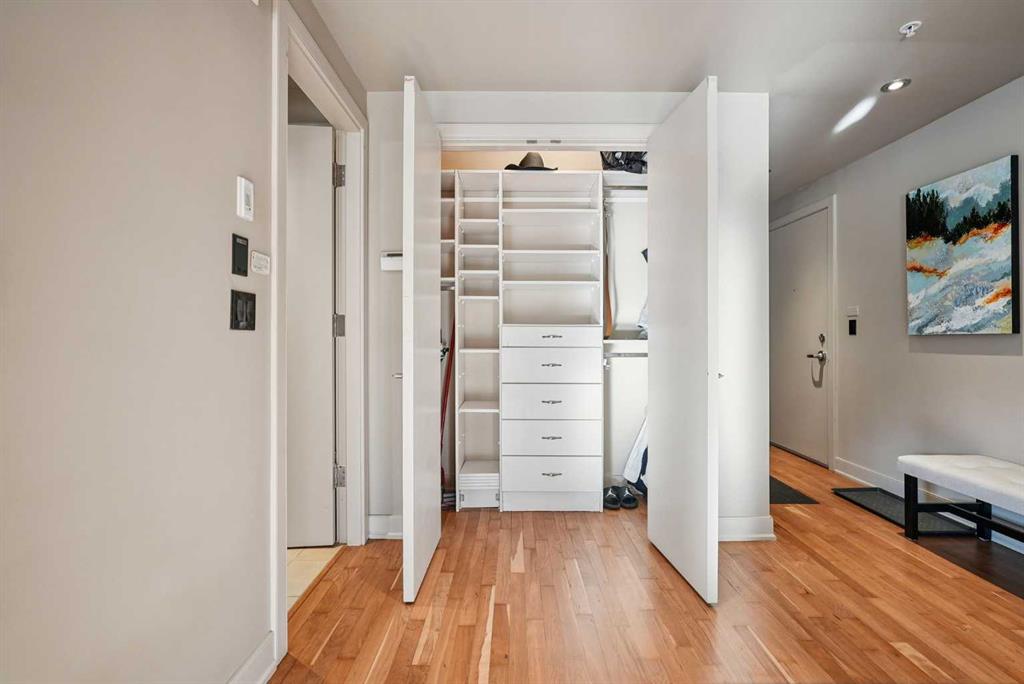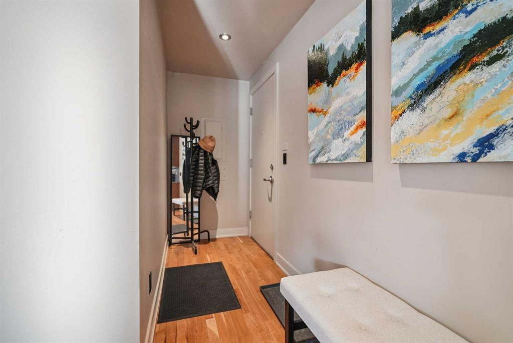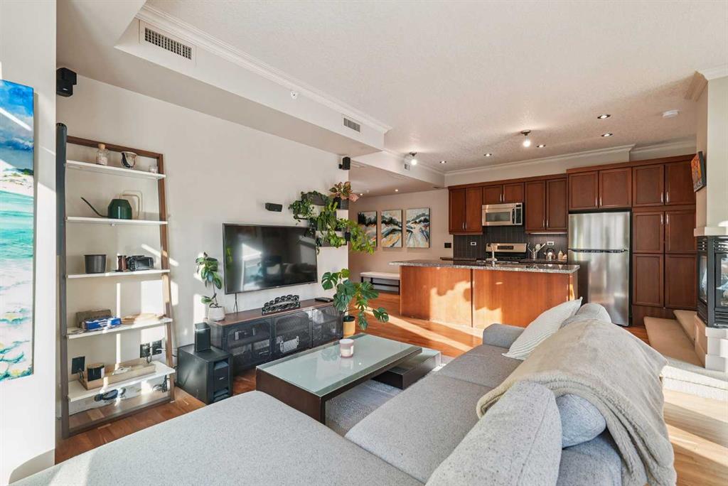 Luxurious upscale studio apartment condo in the prestigious Princeton Cityscape! Exceptional bright southwest corner location with large south and west windows providing plenty of natural light while enhancing the city views. Open concept with high ceilings, hardwood floors, granite counter tops, stainless steel appliances, gas stove, new fridge & dishwasher, built-in vacuum system, 3 sided gas fireplace, 5 built-in speakers, subwoofer and components, large south-facing covered balcony, balcony has rough-in for speakers, spacious 3 pce bathroom with large shower stall, in-suite laundry with stacked washer/dryer and large closet with built-in organizers. Comes with central air conditioning, in-floor heating, secure underground titled parking and storage locker, inner courtyard, visitor parking, underground carwash bay and recently renovated common areas. Extraordinary Heart of Eau Claire location nestled along the south bank of the Bow River next to beautiful Prince’s Island Park and the World-Class Pathway System! Close to great restaurants and Cafe’s, fine dining, plus 15 skywalk system, transportation & LRT, Peace Bridge and just a short walk to Kensington Shops, Safeway and Calgary’s vibrant City Center. Amazing opportunity to call this prestigious building your home while living the ultimate downtown urban lifestyle!