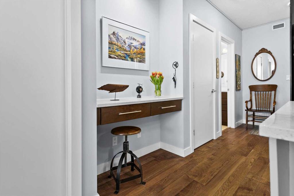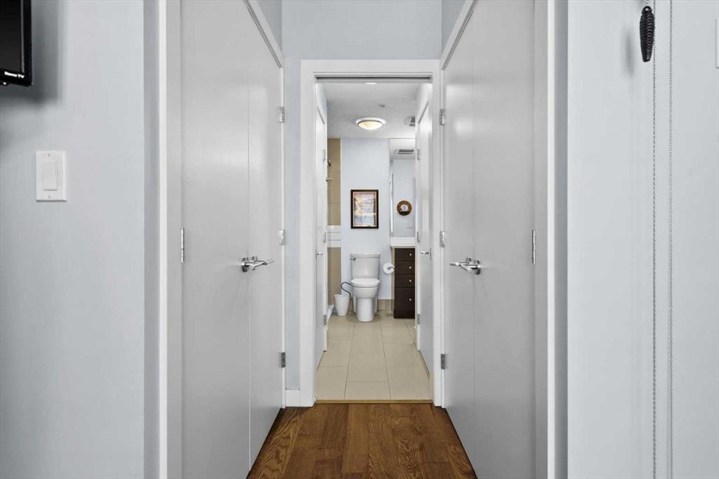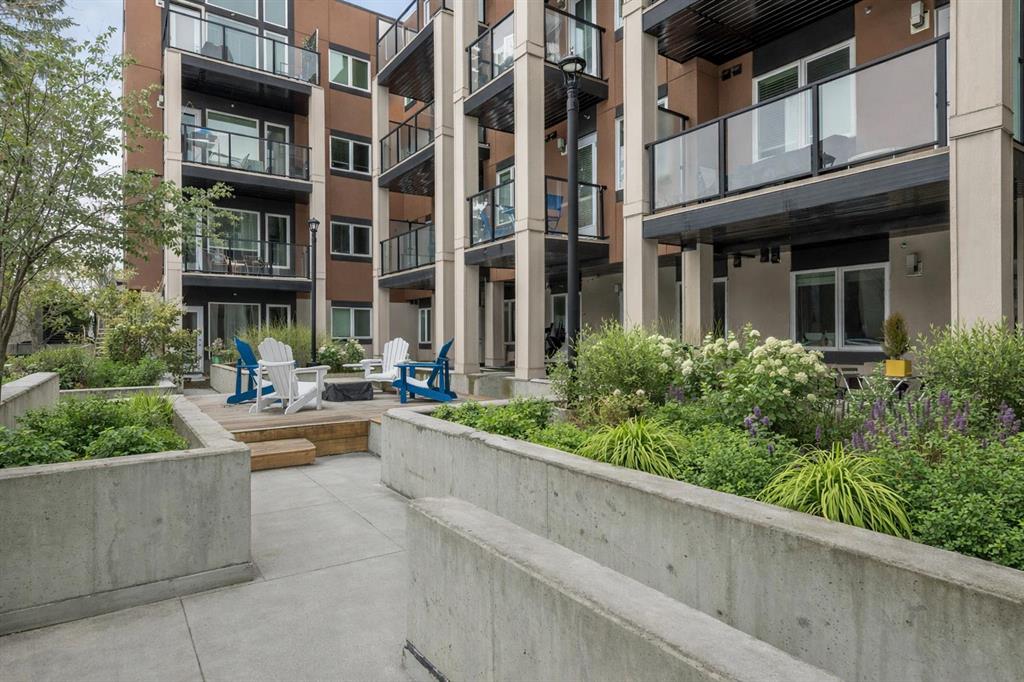 The covered south-facing balcony invites year-round enjoyment, complete with a gas line and intimate balcony seating. In-floor heating ensures warmth through Calgary’s winters, while the addition of air conditioning provides welcome relief in the summer months. UNO is a well-managed, boutique building supported by a proactive and engaged board, with condo fees kept at a reasonable level and backed by a strong, 2025 Reserve Fund Study. Residents also enjoy access to a serene, shared courtyard deck and garden; an unexpected retreat tucked quietly behind the property. Inside, this home is both inviting and functional, ideal for relaxing or entertaining. The spacious primary suite comfortably accommodates a king-sized bed and features a walk-through closet leading to a luxurious five-piece ensuite with dual vanities, a soaker tub, and an upgraded glass shower. Thoughtfully separated for privacy, the second bedroom or optional den, includes its own walk-through closet and direct access to a stylish three-piece cheater ensuite. An oversized titled underground parking stall, secure assigned storage locker, bike room, and an exceptional Royal Avenue SW address. A home that effortlessly combines comfort, style, and location; this is lower mount Royal living at its finest.