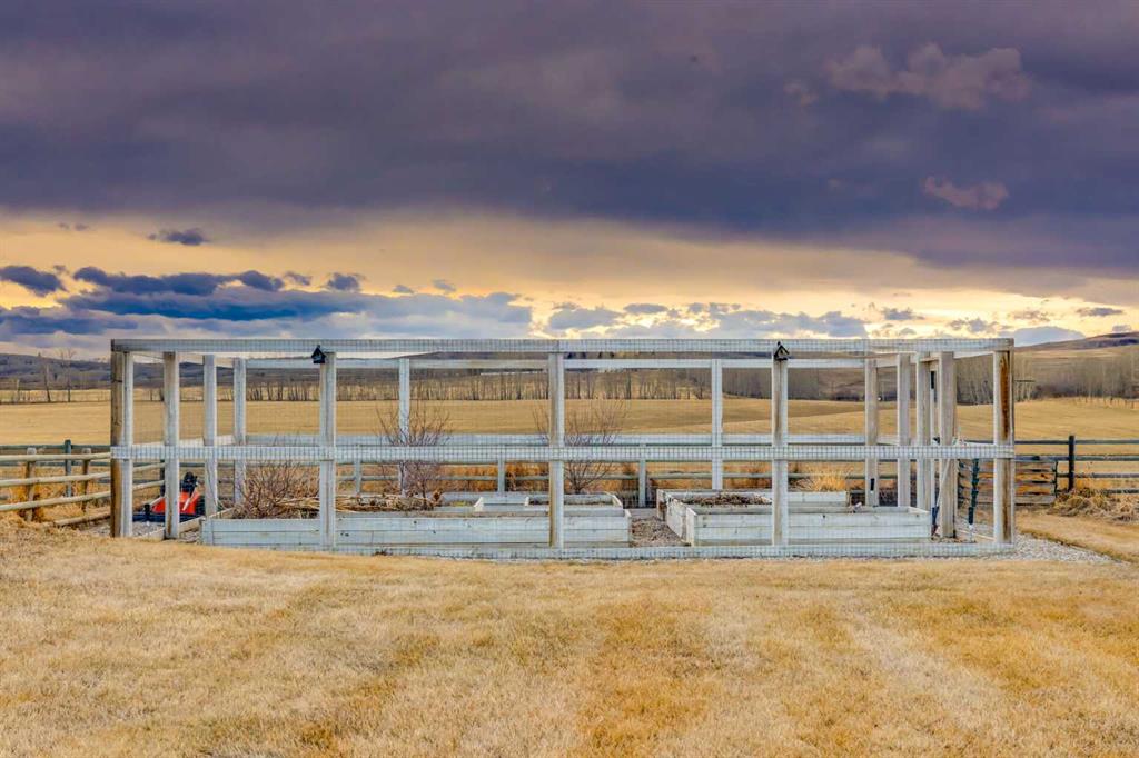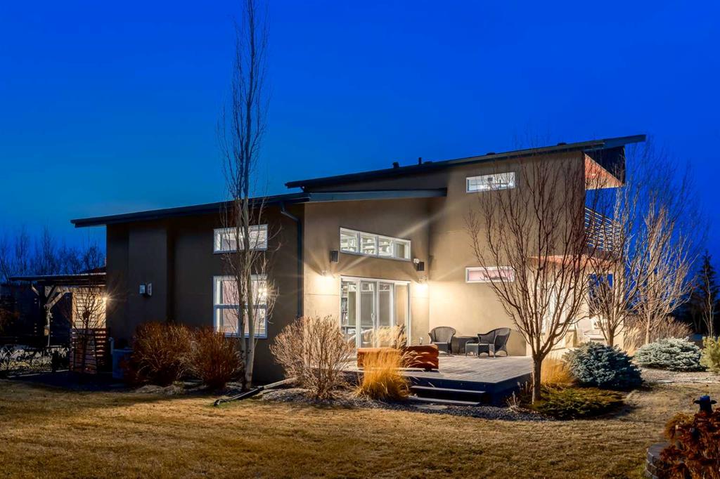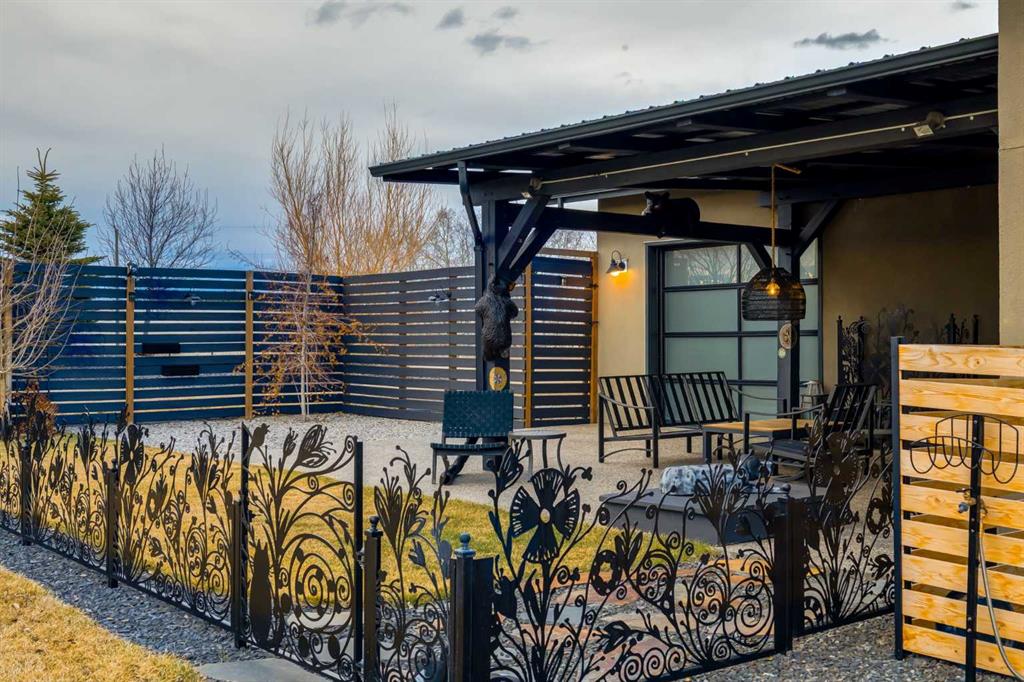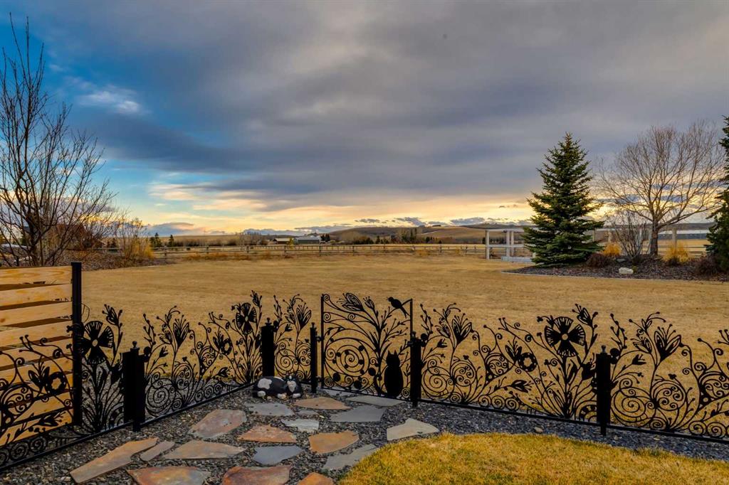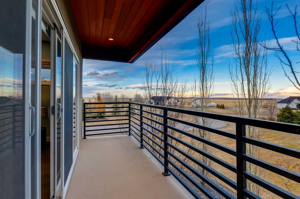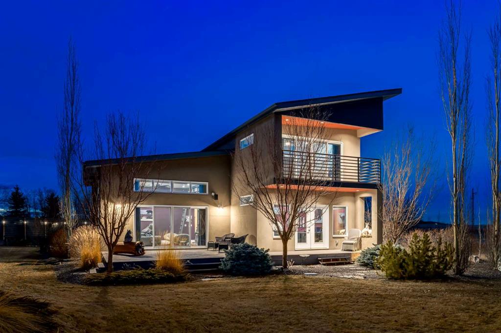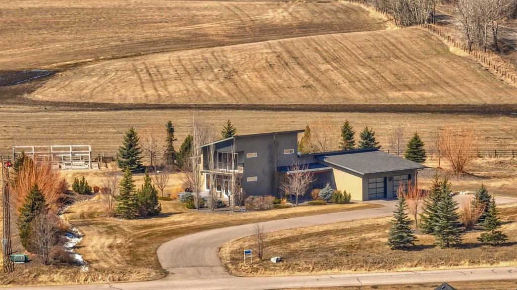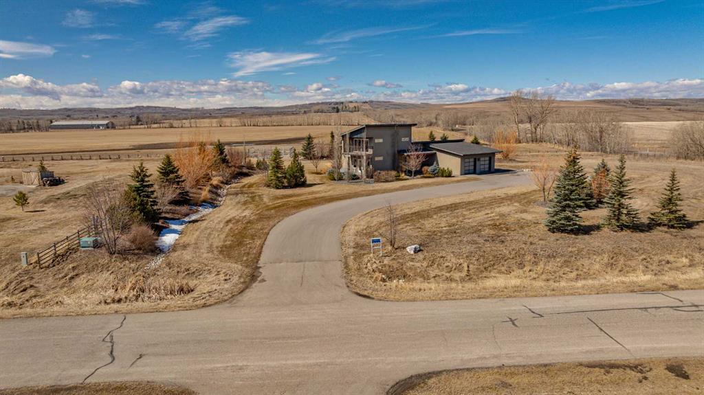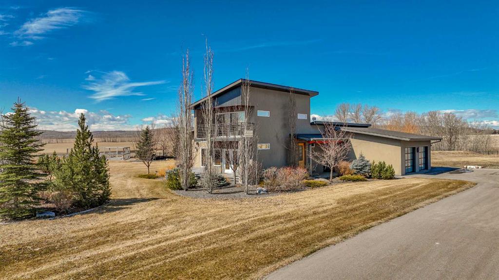 Located in the tranquil community of Fraser Ranch Estates, this modern country home features views of rolling pastoral land while being less than ten minutes from Okotoks, under fifteen minutes to Calgary and within five minutes to the Calgary Polo Club and Strathcona Tweedsmuir School. Professionally designed landscaping blends mature trees with elegant shrub beds offering both privacy and peacefulness and a fully fenced vegetable garden entices your ‘green thumb’. The interior of this home boasts careful curation in every corner, creating a true work of art. From the designer light fixtures imported from Italy to the unique tile patterns in the kitchen and bathrooms, this home is truly one of kind. The main floor includes a spectacular kitchen with new high-end appliances, bamboo grain and feature ‘pull-up’ high gloss brown cabinets and a Concrete Stone waterfall island. The ‘magazine worthy’ living room and dining room boast fourteen-foot ceilings, a full-height painted brick fireplace and an entire wall clad in custom library shelving complete with a rolling ladder. A home office with a custom desk and storage is awash in natural light from the southwest windows. A side deck can be accessed both via the office and through dual sliding glass doors in the living room, creating an indoor-outdoor living experience, and a covered rear patio set off the kitchen features unique design elements and is a perfect spot to watch the sun set in the west. Up an open riser wood staircase lined with horizontal black metal railing, the entire second level is a ‘loft-style’ primary suite. Dual sliding glass doors lead to a private balcony that features stunning views, a spacious walk-in closet is fully adorned with custom storage, and a spa-like ensuite boasts heated floors and a spacious steam shower. The lower level includes a large second bedroom, a full bathroom, an incredible laundry room and a very large ‘flex space’ that offers endless possibilities for a home gym, a hobby room, a home theatre or whatever your heart desires. A dream garage, fantastic features like automatic programable blinds and so much more put this home in a class of its own.