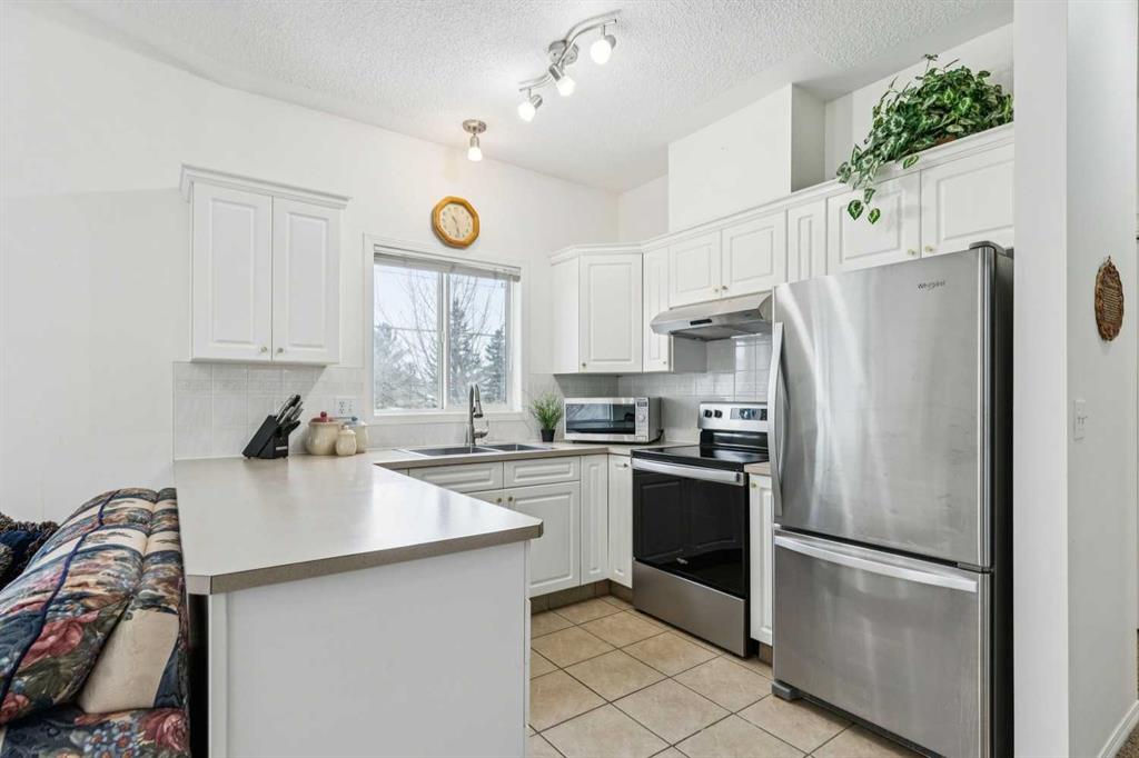 Top-floor corner unit with 9-foot ceilings in the Fairways Pavilions complex. This 2-bedroom, 2-bathroom condo offers an open layout with a tiled foyer, vaulted ceilings, and good natural light from large windows. The kitchen features a wrap-around counter with a breakfast bar and a separate eating area. The living room includes a corner gas fireplace. The primary bedroom has a walk-in closet and a 3-piece ensuite. The second bedroom is next to a 4-piece bathroom.