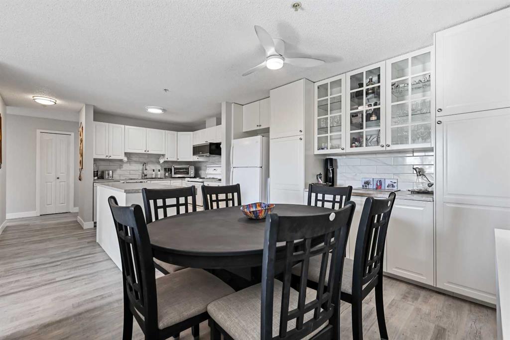 Welcome to this impeccably upgraded 2-bedroom, 2-bath condo in the sought-after Somerset Crossing – one of the largest floor plans available in the complex, offering over 1,000 square feet of beautifully designed living space. Nestled in the heart of Somerset, just steps from Shawnessy’s shopping, dining, and amenities, this stunning home combines comfort, function, and style in one of Calgary’s most walkable neighborhoods. Step inside to discover brand-new luxury vinyl plank flooring flowing seamlessly throughout the main living areas, giving the home a modern yet warm feel. The kitchen has been completely reimagined with a custom flush central island, perfect for prepping meals, entertaining guests, or enjoying your morning coffee. Extended cabinetry, finished with elegant glass insets and a matching countertop, stretches into the spacious dining area—providing tons of extra storage and display space, rarely found in condo living. The open-concept living room is generous in size, basking in sun-soaked Southeast exposure with unobstructed views of the peaceful courtyard and shimmering pond beyond. Step through the sliding glass doors onto your covered patio, where you can relax and enjoy the view—patio furniture included, so you’re ready to unwind from day one. Both bedrooms are privately tucked away, each enjoying bright southeast light. The primary suite features a large closet and a beautifully renovated 3-piece en suite with a stunning oversized walk-in shower, floor-to-ceiling tile, and sleek glass doors. A second 4-piece bath is perfect for guests or family. Practical touches abound, including a spacious entryway with room for a bench and a massive in-suite laundry/storage room—complete with the original island repurposed as a folding station or work surface, along with built-in shelving for smart, out-of-sight organization. You’ll also enjoy the convenience of one titled underground parking stall, and peace of mind knowing you’re in a well-managed, sought-after building where residents tend to stay for the long haul. With quick access to Macleod Trail & Stoney Trail, Spruce Meadows just minutes away, and walkable access to everything from groceries to coffee shops and fitness studios, this location truly has it all. With quick access to the Somerset C-Train, heading to down town to enjoy all that Calgary has to offer is ideal – perfect to enjoy a nice blend of urban and suburban. Rarely do units like this come available—especially with these upgrades, size, and that unbeatable view. Don’t miss your chance to make this exceptional condo your next home!