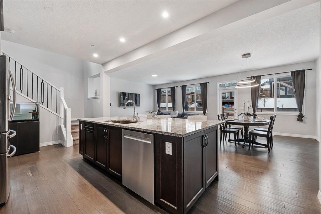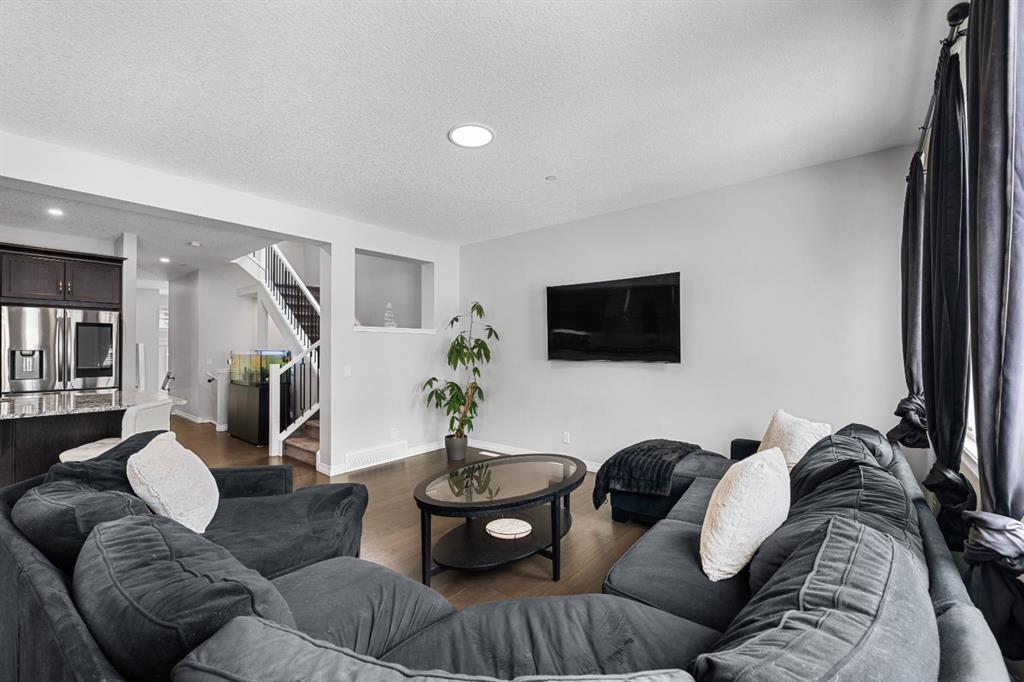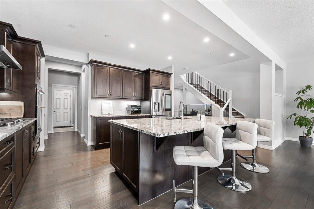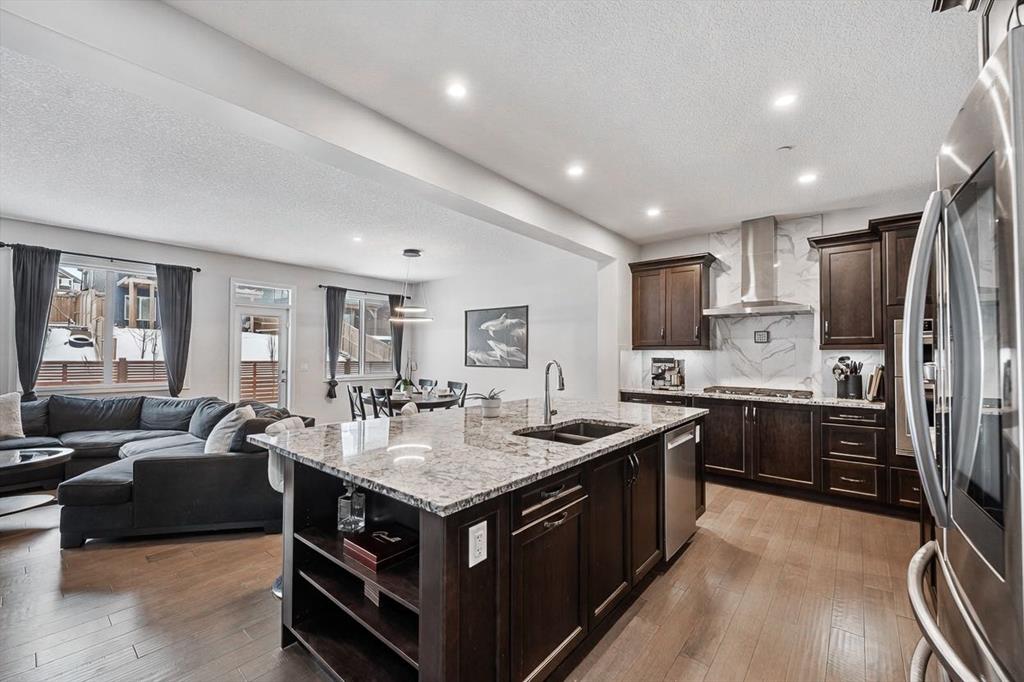 Welcome to 308 Lucas Way NW, a beautifully upgraded detached home offering over 2,600 sq ft of living space, in the vibrant community of Livingston. With modern finishes, energy efficient upgrades, and a thoughtfully designed layout, this home offers the perfect balance of comfort, style, and functionality. The open concept main floor features rich hardwood flooring and a stunning chef inspired kitchen complete with granite countertops, a large central island, built-in gas cooktop, built-in oven, stainless steel appliances, and a modern smart screen refrigerator. The space flows seamlessly into the dining and living areas, making it ideal for everyday living and entertaining. A dedicated main floor office provides the perfect setup for working from home.