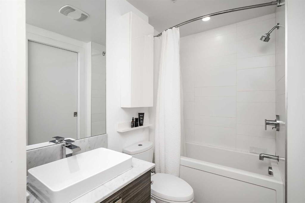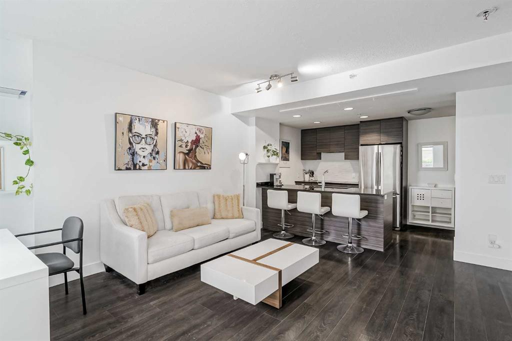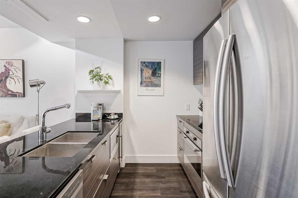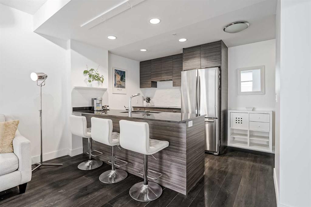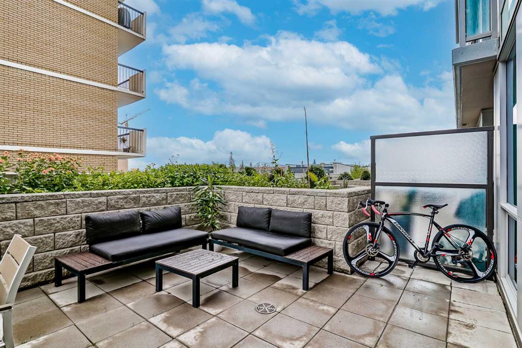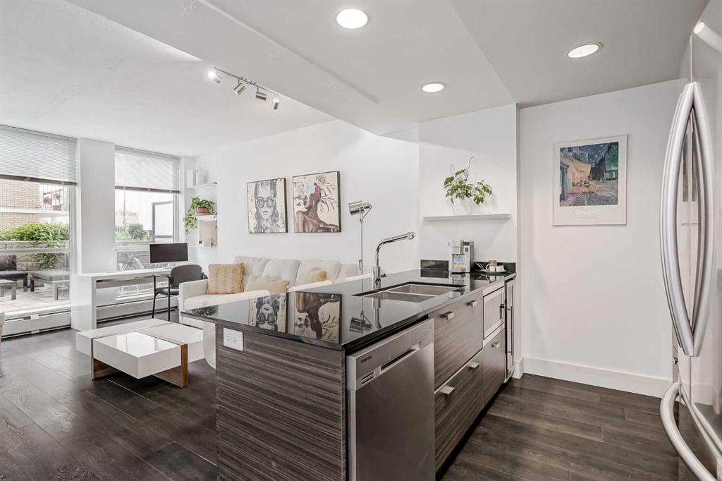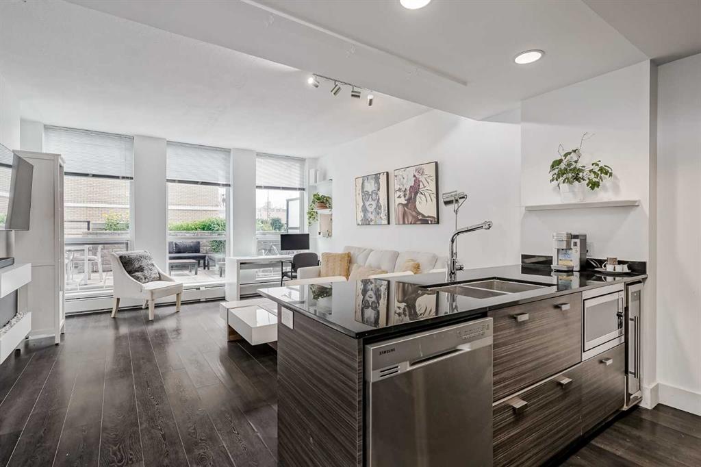 Welcome to this gorgeous 1 bedroom, 1 bathroom condo in one of Calgary’s most desired buildings, The Drake. This home really does have it all with 492 square feet of living space and an ABSOLUTELY MASSIVE TERRACE. As you walk in you are greeted with beautiful dark wood floors throughout the home starting with your kitchen, equipped with stainless steel built-in appliances, glass cook-top, granite counter tops, and a eat up bar area. Your kitchen flows into your living room making for a perfect entertaining space and is wrapped with floor to ceiling windows overlooking your expansive terrace. Your bedroom is large enough for all of your bedroom furniture and has a pocket door for direct access to your full bathroom. The terrace of this unit is ONE OF THE LARGEST IN THE BUILDING and is really what makes this unit special as there are only a few units that offer such a large outdoor space. This space is great for entertaining, BBQ’ing with friends and family, gardening, morning coffee or just basking in the sun. Truly a unique offering. The home comes with titled underground parking and a titled storage unit. The Drake is one of the most sought after buildings in Calgary being steps away from 17th avenue shops, restaurants, parks, pathways and not far from the river. There are great schools in the area and access to transit to get wherever you need to go in the city. Do not miss out on this opportunity to own this great home with huge outdoor space in a wonderful building.
