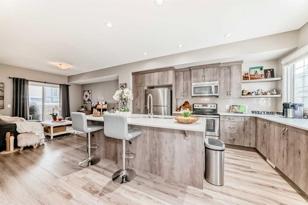 The chef-inspired kitchen features full-height warm-tone cabinetry with stylish exposed shelving, a large central island, and a built-in pantry—both functional and visually striking. Upstairs, the spacious primary bedroom offers a 4-piece ensuite complete with dual vanities, a walk-in shower, and a walk-in closet. Two additional well-sized bedrooms, a full bathroom, and convenient upper-level laundry complete this floor.