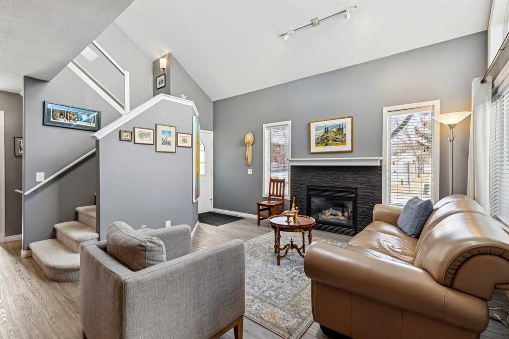 Soaring vaulted ceilings and large windows flood the open-concept main floor with natural light, highlighting the elegant living area with gas fireplace, generous dining space, and a well-appointed kitchen with breakfast bar, pantry, and updated appliances. A main-floor bedroom with full ensuite and walk-in closet offers exceptional flexibility for guests or a home office, while the private patio provides a quiet outdoor retreat.