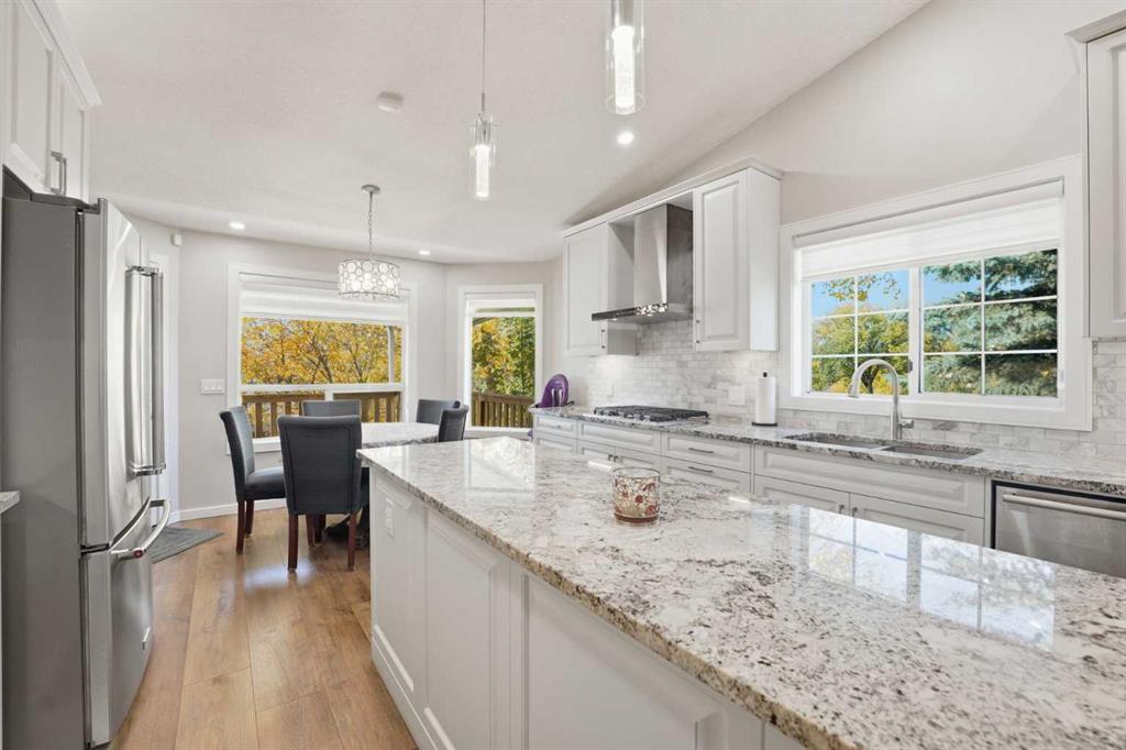 HONEY! START THE CAR! Welcome home to this BEAUTIFUL corner lot, adjacent to GREENSPACE, where MODERN ELEGANCE meets FUNCTIONALITY. This spacious 2,382 square feet in total bi-level DETACHED home with a DOUBLE ATTACHED GARAGE is sure to IMPRESS! This property has many FEATURES that you will LOVE, including the unique floor-plan with the living room located on the main floor level, and the OPEN CONCEPT layout with MODERN flat textured high VAULTED CEILINGS. RECENT RENOVATIONS have been done inside this property from TOP to BOTTOM! This property FEATURES new high-end STAINLESS STEEL appliances, GRANITE counter tops, CUSTOM cabinetry with tons of storage space, a LARGE kitchen Island, BUILT-IN convection oven and microwave, a 5-burner GAS RANGE STOVETOP, GORGEOUS wide-plank scratch resistant flooring throughout, NEW carpets throughout, MODERN flat textured ceilings throughout, high-end CLASSY light fixtures and pot lights, CUSTOM window coverings, DECK access conveniently located off of the kitchen, 4 spacious sized bedrooms, including the primary bedroom with a WALK-IN CLOSET and 4-PIECE ENSUITE, 3 full bathrooms FEATURING TILE FLOORING, TILE BACKSPLASH, and GRANITE countertops, JETTED bathtub on the lower level, LOTS of windows throughout allowing for lots of NATURAL sunlight, the laundry room features a LARGE window and a LARGE sink, lots of STORAGE SPACE, a WELL-KEPT and spacious FULLY FENCED backyard, included with this property is an A/C unit for those hot spring and summer months, and the ICING ON THE CAKE – this property features high-end GEMSTONE EXTERIOR lighting!!! Make this IMPRESSIVE property your new home, this property will not last long, call your favourite realtor today!
