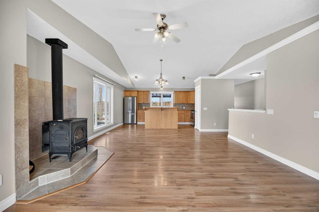 THIS COULD BE YOUR NEXT HOME!!! If you are looking for a quiet neighborhood in Didsbury for your family to move into you will want to check out this lovely home! This fully finished bungalow is in one of the best locations in town considering there is green space directly behind you and there is a walking trail for you to utilize that allows you to get out and enjoy the scenery here. Step inside and you will notice there is an open floor plan with vaulted ceilings. The living room has a WOOD BURNING STOVE great for those colder winter days and there is CENTRAL AIR for those blustery summer days. The kitchen has a large island with eating bar, tiled backsplash, newer appliances and there is that great view out to the back yard. The primary bedroom has a walk in closet and full ensuite plus there are two other bedrooms on the main level. There is also a full bathroom, laundry area and access out to the covered rear deck which makes sitting outside really nice. Heading downstairs to the finished basement you will find a large family room with convenient wet bar (fridge is included); this provides you more space for those get togethers and is very comfortable with the infloor heat. There are two more bedrooms, another full bathroom, a storage room and mechanical room to complete this home. Parking is covered here too with a double detached garage and there is a shed in the backyard that may double as a playhouse for the kids. This home is ready for you to move right into and will provide many happy years for your family. The neighbors are even really nice! Call today to book a viewing!