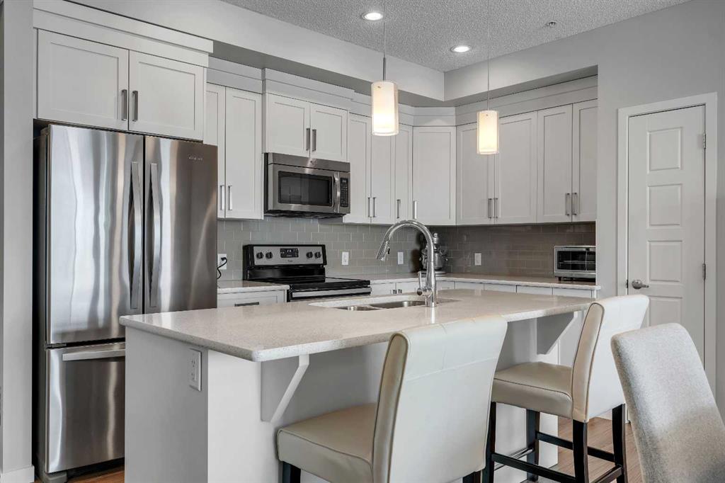Welcome to this light-filled and beautifully designed 2-bedroom, 2-bathroom condo in the highly sought-after community of New Brighton. Offering a fantastic layout with 9-foot ceilings and triple-pane windows, this bright and airy unit is filled with natural light and designed for comfortable, modern living. The open-concept kitchen is a true standout, featuring a spacious 7-foot island with quartz countertops, stylish tile backsplash, stainless steel appliances, and ample cabinetry—perfect for cooking, entertaining, or casual dining. The kitchen flows seamlessly into the dining and living areas, creating an inviting space to relax or host guests. Step out onto your private balcony and enjoy peaceful pond and mountain views, stunning sunsets, and the convenience of a BBQ gas hookup—an ideal outdoor retreat. Inside, durable laminate flooring enhances the main living areas, while both generously sized bedrooms offer plush comfort. The primary suite is complete with twin closets and a large ensuite featuring an oversized walk-in shower. A second spacious bedroom and full bathroom make this home ideal for guests, roommates, or a home office.