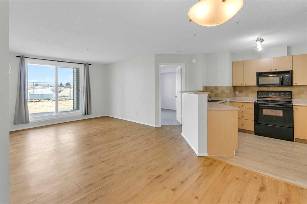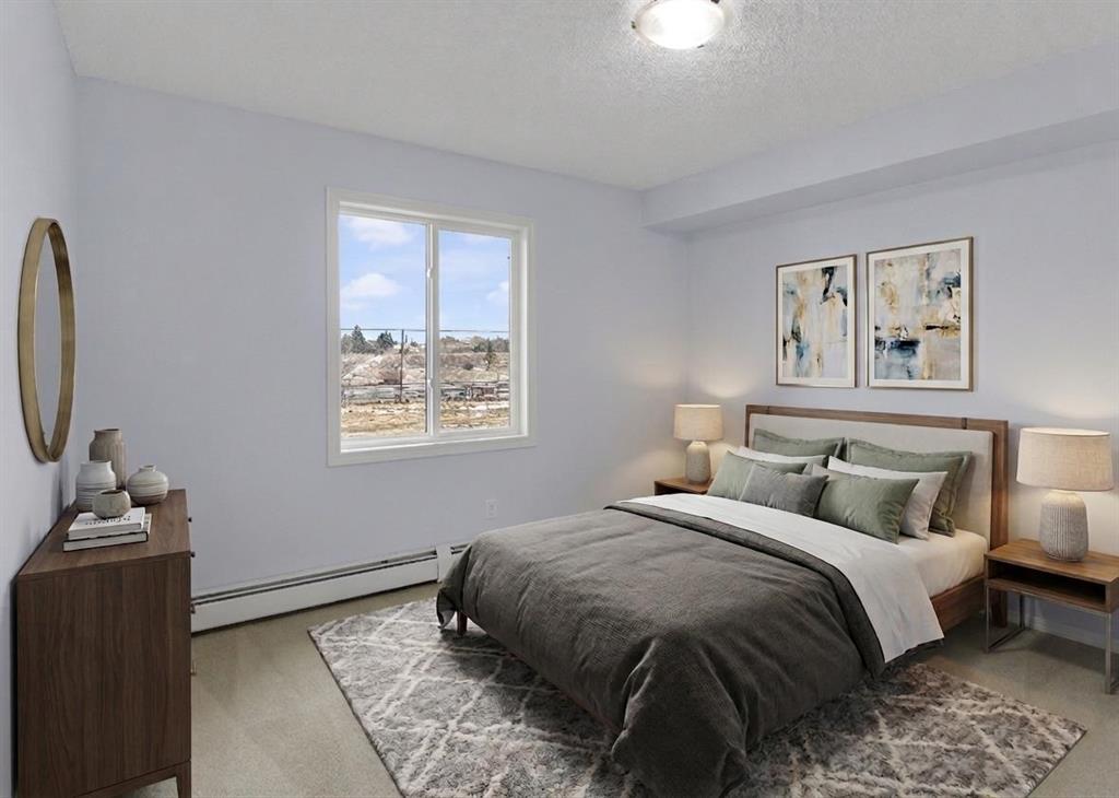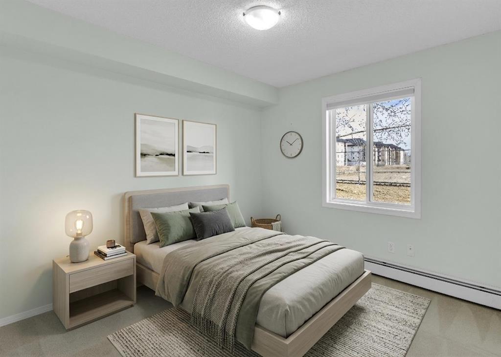 HOME SWEET HOME! Calling all savvy investors and home buyers! This is your amazing opportunity in the HEART OF DOWNTOWN AIRDRIE close to main street offering a stylish and spacious condo boasting 2 bedrooms, 2 bathrooms, 838+ move-in ready, beautifully maintained SQFT of living space and the best underground parking stall that’s the size of almost 2 stalls. This large condo is well positioned on the scenic side of the building facing Iron Horse Park. Heading inside you will be blown away by the extremely functional, wonderfully laid out open concept floor plan. You will find a bright foyer, formal dining room, an elegant 4 piece bathroom, sun-drenched living room and a chef’s kitchen complete with full appliances, ample cabinet and counter space and a peninsula island with a convenient breakfast bar. Completing this unit a great-sized bedroom and the primary retreat with a walk-through closet and fantastic 4 piece ensuite bathroom. Additional highlights include the patio area that’s ideal for entertaining, in-suite laundry, lots of storage space inside the unit and the OVERSIZED, UNDERGROUND, HEATED PARKING STALL that is almost the size of 2 stalls. This PET FRIENDLY complex (with board approval) was upgraded in 2024 with all windows replaced by new, energy-efficient vinyl units adding both value and comfort. This unbeatable location is within walking distance to Sobey’s, restaurants, medical clinic, gym and downtown, schools, parks and a quick drive to Calgary. This is the investment opportunity you have been searching for, book your private viewing today! Listing features virtual staging.