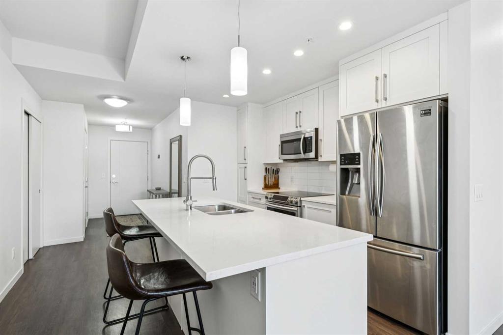 Welcome to this exceptional 2 bedroom, 2 bathroom corner unit in the sought-after Tela Building, ideally located on arguably Mission’s best street 22nd Avenue SW. Just steps from the area’s top inner-city amenities, this street-facing condo is tucked on a quiet, tree-lined block and offers the perfect blend of privacy, light, and location. Situated in the northwest corner of the third floor, this bright and airy home features 9-foot ceilings, central air-conditioning, a thoughtfully designed 870 sq ft floorplan, and two titled underground parking stalls plus a storage locker. Large windows throughout flood the space with natural light, while downtown views can be enjoyed from both the primary bedroom and the private balcony. The open-concept kitchen is designed for both everyday living and entertaining, complete with a central island with quartz countertops, stainless steel appliances, and seamless flow into the dining and living areas. Step outside to the balcony overlooking mature trees, with sightlines north to downtown and west toward 4th Street, and a gas line for BBQ. The spacious primary bedroom offers a peaceful retreat, overlooking a beautiful mature tree that creates a canopy of greenery in the spring. The attached ensuite features double quartz vanities, tile flooring, and a large walk-in shower. The second bedroom is generously sized with west-facing windows for warm afternoon light and is conveniently located near the full second bathroom ideal for guests. Additional highlights include pet-friendly living, secure underground parking with side by side stalls, secure bike storage and unbeatable access to Mission’s vibrant shops, restaurants, grocery stores, banks, transit, and professional services along 4th Street. Enjoy walking or cycling the Elbow River pathways, located less than five minutes from your door. This is a fantastic opportunity to enjoy quiet, inner-city living in one of Calgary’s most desirable neighbourhoods.
