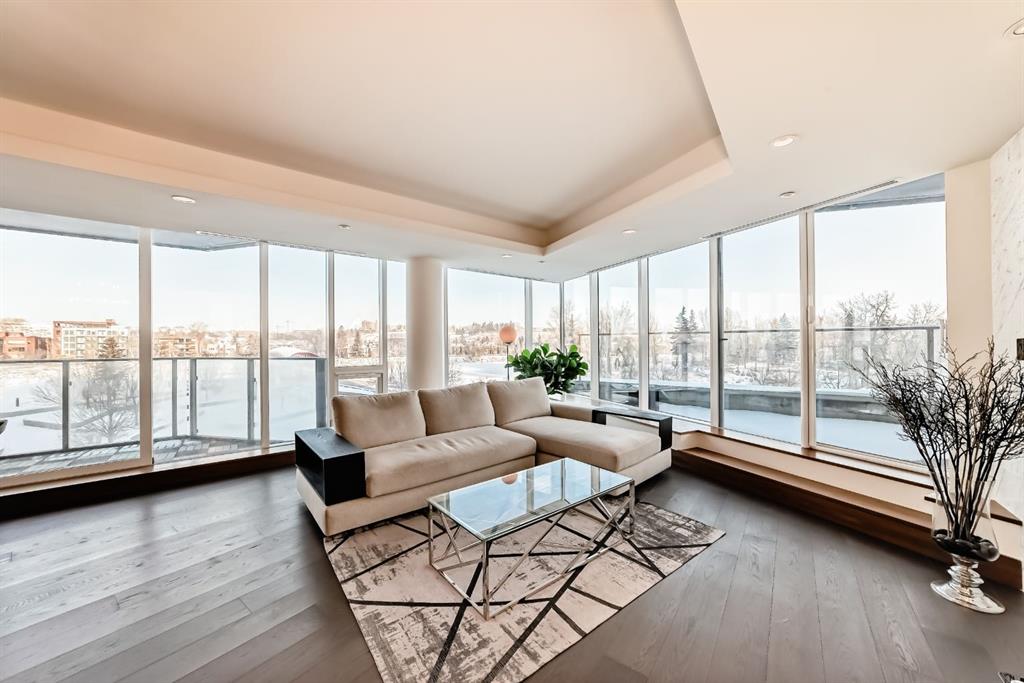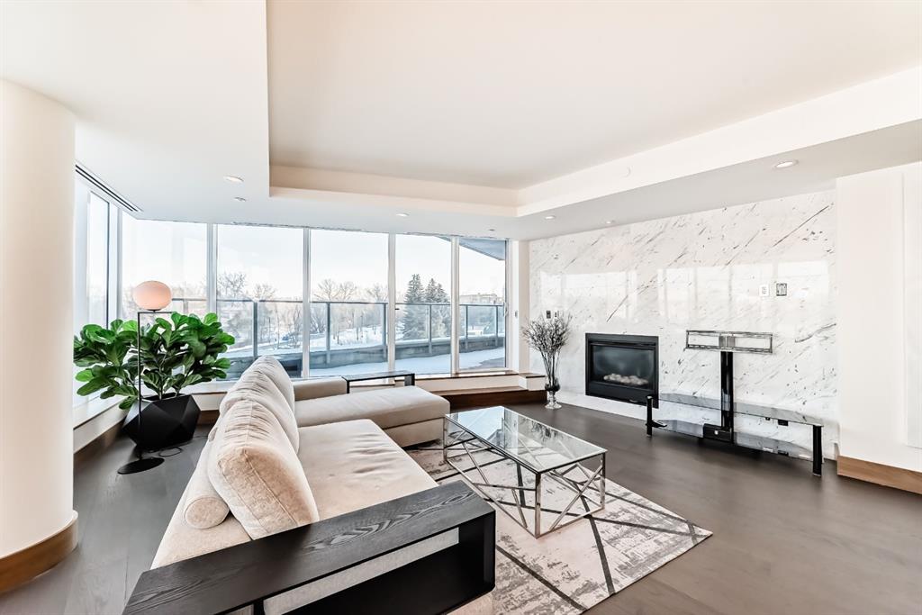Experience elevated riverfront living in this exceptional original-owner residence at The Concord, ideally situated across from Calgary’s iconic Peace Bridge in prestigious Eau Claire. Offering nearly 2,000 sq. ft. of refined interior space with unobstructed NW and E river views through floor-to-ceiling windows, this luxurious suite features private elevator access to your exclusive foyer, an expansive open-concept layout, hardwood flooring, marble finishes, walnut accents, LED lighting, built-in speakers, heated bathroom floors, and full Control4 automation. The designer Poggenpohl kitchen is equipped with white stone countertops, a large island with seating for four, and premium Miele appliances including a gas cooktop, built-in refrigerator, and wine fridge, seamlessly connecting to the formal dining area and spacious living room with gas fireplace and access to two private balconies. The primary retreat offers balcony access, a custom walk-in closet, and a spa-inspired 5-piece ensuite with dual vanities, marble and glass shower, heated floors, and jetted soaker tub, while the second bedroom also features balcony access and a private 4-piece ensuite with heated flooring. Additional highlights include a separate laundry room, Level 2 EV charging, an oversized private garage, and one of the largest storage units in the building. Residents enjoy 24-hour concierge service, heated underground guest parking, car wash bay with undercarriage wash, fitness centre, elegant party room, and a beautifully landscaped patio with BBQ area overlooking a serene pond that transforms into a winter skating rink—an extraordinary opportunity to own in one of Calgary’s most prestigious addresses.