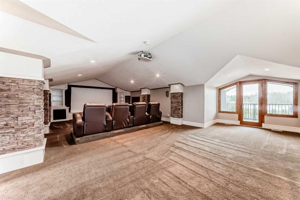 The second level features a dedicated theatre room with fully reclining leather seating, its own separate bathroom, and private balcony, creating a true at-home cinema and entertainment space.