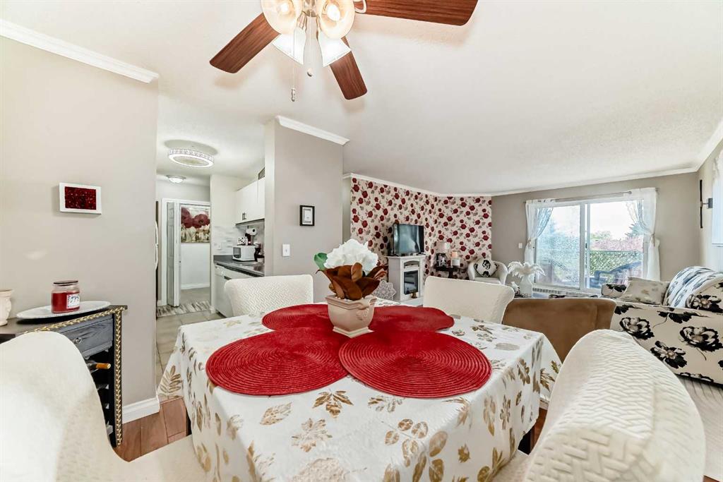 Enjoy unbeatable connectivity with quick access to downtown, Deerfoot Trail, and Stoney Trail — an ideal location for commuters and city explorers alike. Welcome to Dover Pointe, where homeownership becomes an attainable and rewarding step forward. This bright and thoughtfully updated two-bedroom, one-bath condo is perfectly situated on the third floor, offering beautiful southwest-facing views from your private balcony — the perfect place to enjoy your morning coffee or unwind at the end of the day. Inside, a functional galley-style kitchen has been tastefully refreshed with new tile, a new hood fan, ceiling fan, and a newer stove, blending everyday practicality with modern updates. The adjacent dining area flows seamlessly into a spacious, sun-filled living room, creating an inviting space for both entertaining and relaxing. The home features durable laminate flooring throughout the main areas, elegant crown moulding, and brand-new carpet in both bedrooms for added comfort. Each bedroom offers generous closet space, while the convenience of in-suite laundry enhances day-to-day living. This well-managed, pet-friendly complex includes heat and water in the condo fees, along with an assigned outdoor parking stall. Enjoy nearby green space at Southview Off-Leash Park just a short walk away, plus easy access to a variety of local dining options and the extensive amenities of Deerfoot Meadows, including IKEA, Costco, and more. Whether you’re a first-time buyer or looking to downsize, this home offers exceptional value, comfort, and convenience — a smart alternative to renting.