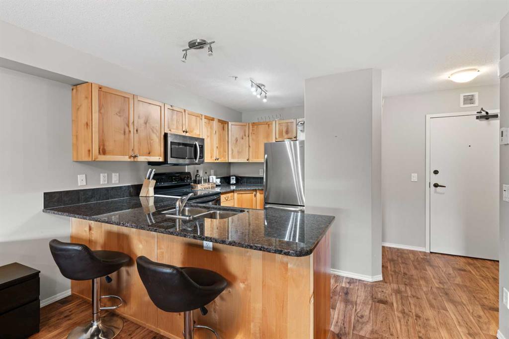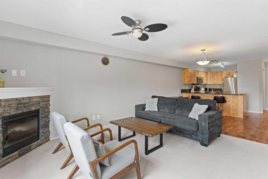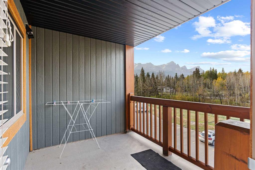 Wake up to uninterrupted mountain panoramas in this bright, refined 1-bedroom + den residence in Canmore. Elevated on the 3rd floor, the home is perfectly positioned to capture all-day natural light and sweeping Rocky Mountain views that frame every room. The gourmet kitchen, finished with granite countertops, seamlessly integrates with the dining and living areas, extending onto a private balcony where the mountains feel impossibly close. The primary bedroom enjoys the same breathtaking outlook, while the spacious den offers an ideal home office, reading room, or additional guest space. Convenience is unmatched with an outdoor parking stall steps from the entrance and an oversized 11′ x 7′ heated storage locker—one of the largest in the building. The community enhances your lifestyle with a fully equipped fitness centre, children’s playground, dog park, and workshop, along with direct access to scenic trails that define the Canmore experience. Secure underground parking adds an extra layer of comfort, and residents enjoy exceptional amenities including a modern fitness facility, ski and snowboard tuning room, carpentry room, and a welcoming common lounge perfect for gatherings and celebrations. This is more than a home—it’s a luxury vantage point to the Rockies and a gateway to the Canmore lifestyle.