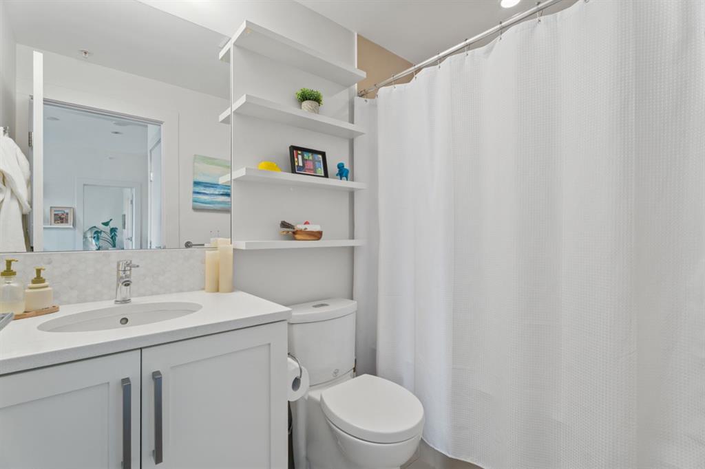 The open-concept layout features a spacious living/dining area filled with natural light, a modern kitchen with stainless steel appliances and stone countertops, and a convenient breakfast bar for casual dining. The primary suite includes a walk-in closet and a full ensuite, while the second bedroom and 4-piece bath provide flexible space for guests or a home office.