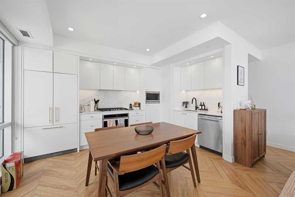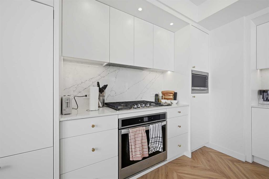 The contemporary kitchen is a true centerpiece, showcasing sleek white quartz countertops, a gas cooktop, integrated refrigerator, ample cabinetry, and a stylish backsplash—perfect for both everyday living and entertaining.