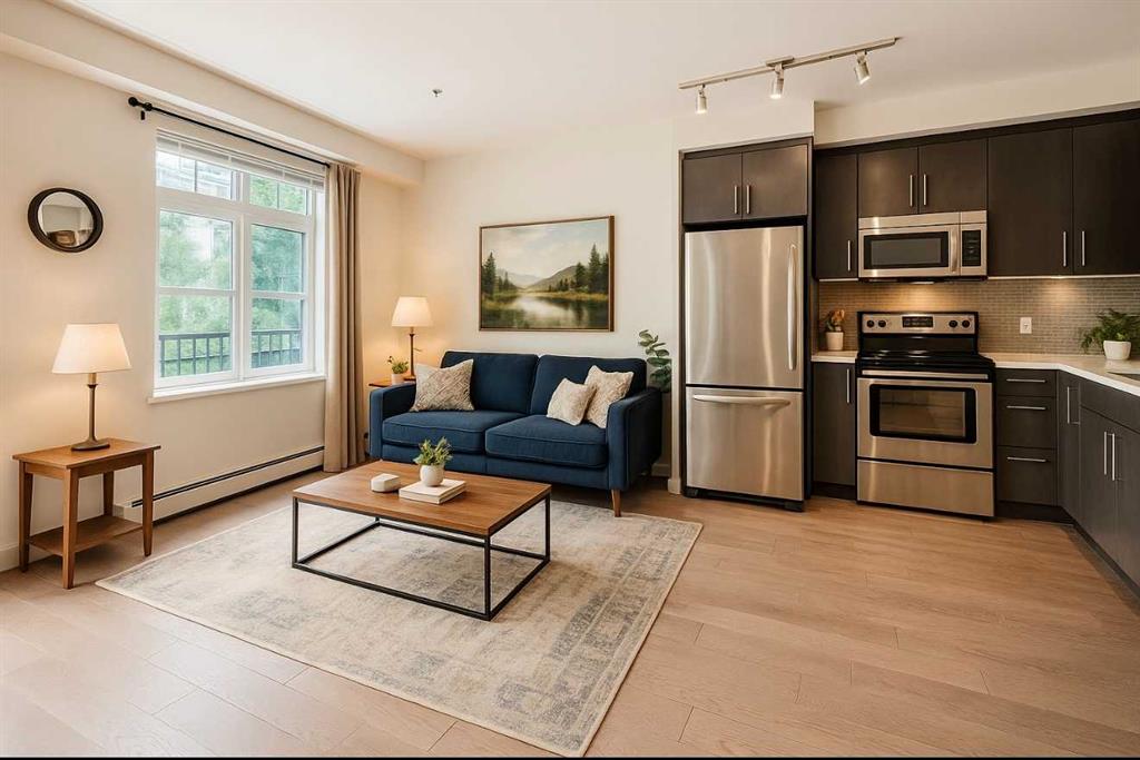 Modern two bedroom condo with MOUNTAIN VIEWS and UPGRADES! Welcome to this unique and open condo in the sought after community of Auburn Bay. This condo will exceed your expectations upon arrival. Step into your gorgeous BRIGHT KITCHEN with QUARTZ countertop, tiled backsplash, plenty of cabinet and counter space and stainless steel appliances. This unit is packed with every available upgrade including wide plank LVP flooring, increased capacity washer and dryer, 9 foot knock down ceilings and lots of STORAGE and built in shelving. The 4 piece bathroom has two door for easy access from the bedroom or living space. Your new primary bedroom is bright with a large window and a walk through closet. This unit also has a second bedroom with a barn door. You will appreciate the view that faces the courtyard and is extremely quiet. The private OVERSIZED BALCONY with NATURAL GAS outlet offers a quiet place to entertain with courtyard and MOUNTAIN VIEWS. This home also includes HEATED UNDERGROUND PARKING with direct access to the elevator and a large storage unit. One of Calgary’s PREMIER LAKE COMMUNITIES that offers a year round lake, tennis courts, beach, volleyball, skating and swimming. You are also minutes away from the SOUTH HEALTH CAMPUS HOSPITAL, YMCA, VIP THEATRE, many restaurants and pubs, shopping and schools, public transit, Deerfoot and Stony Trail and off leash dog park. This is a must see!