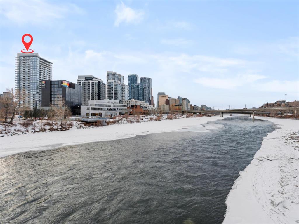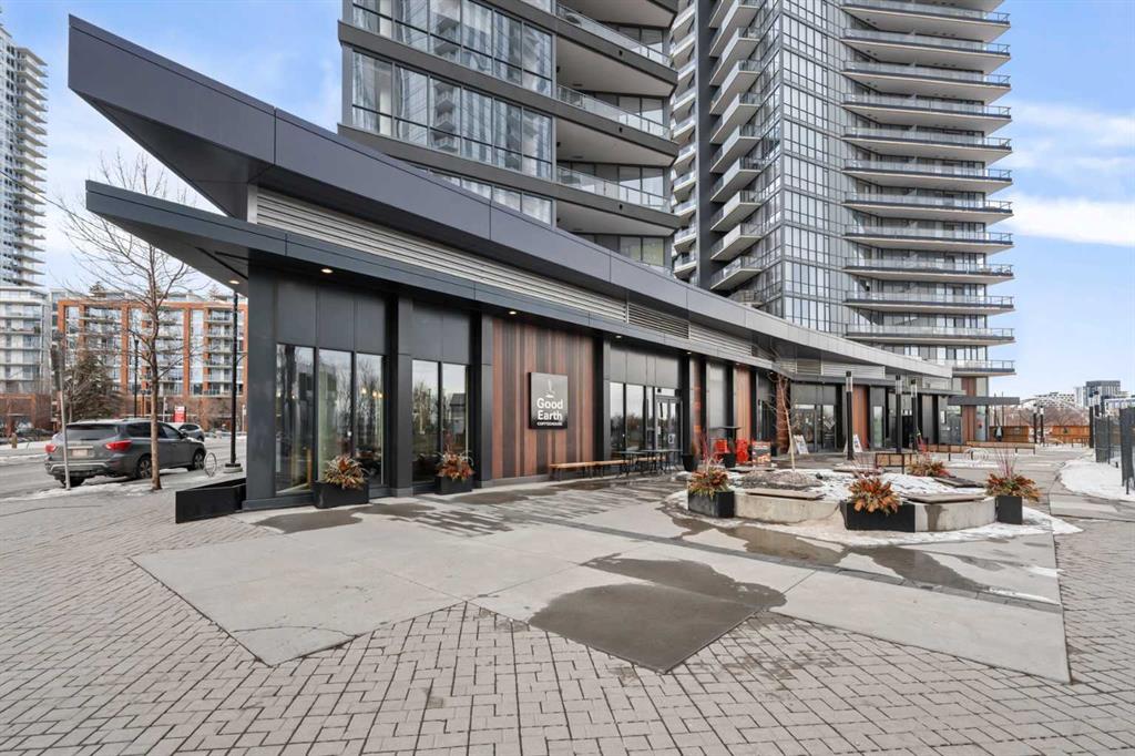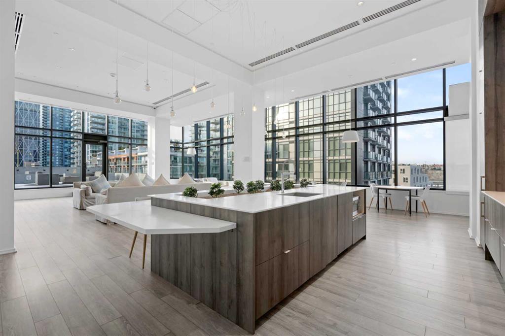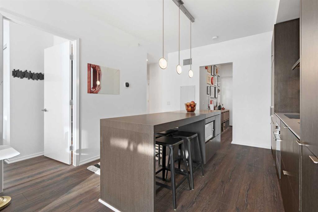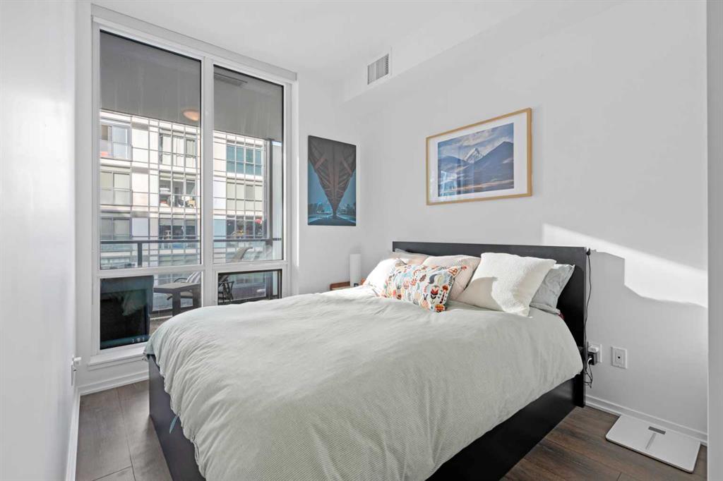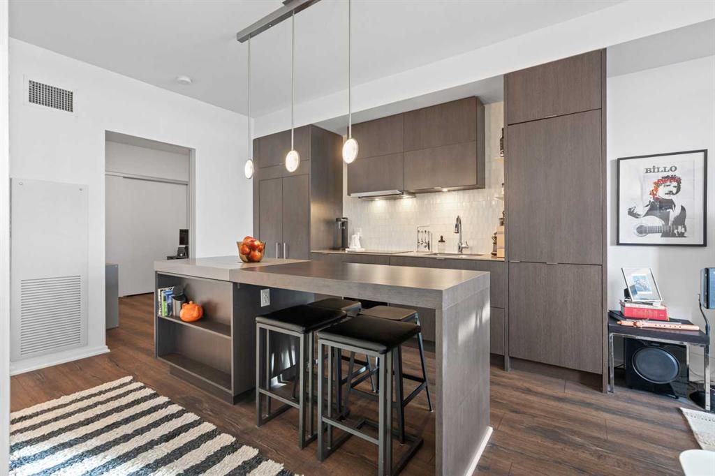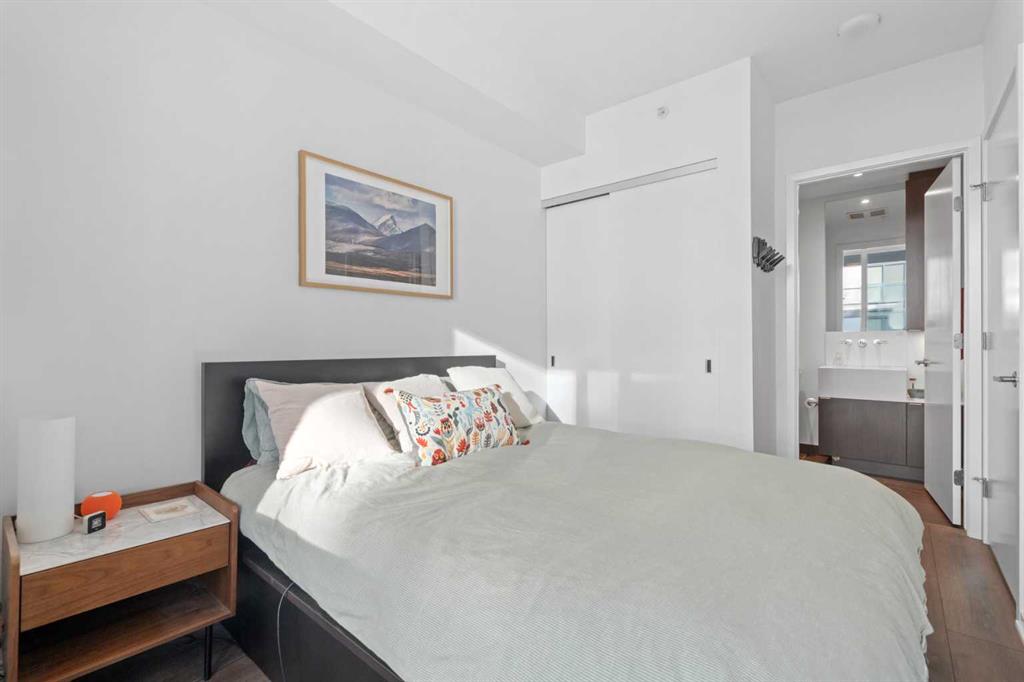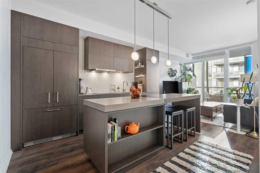 Welcome to Verve – a high quality building by FRAM and Slokker, offering unmatched value and an array of top-notch building amenities. This immaculate 2 bedroom, 2 full bathroom condo offers an ideal floorplan, with flexibility to have multiple work-from-home spaces or easily accommodate having a roommate. Designed by the award winning international designer, Cecconi Simone, the floorplan is flawless, being very functional and efficient with clean and modern finishes. Upon entering the unit, you are greeted by a spacious foyer with room for a bench or shoe rack as well as a full-sized front closet. Further down the entry way, there is the perfect nook for an office desk or additional storage. The European-styled kitchen features sleek cabinetry, built-in appliances, custom-designed pendant lighting and a smart eat-in island that fits four. The kitchen is fitted with quartz countertops, a stainless steel under-mount sink with a pull-out faucet, mosaic tiled backsplash and under-cabinet led lighting. With bedrooms and bathrooms on opposite sides, privacy is maximized. The closets have been finished with custom closet organizers, providing plenty of storage. The modern bathrooms come with custom cabinetry, beautiful lighting, a luxurious soaker tub and a spacious shower with a glass enclosure. Floor to ceiling windows span the living room which opens up to an oversized balcony, encompassing a seamless blend of indoor/outdoor enjoyment. The unit is completed with in-suite laundry, a spacious titled parking stall and a storage locker. Residents of Verve enjoy full-time concierge services, a boutique hotel-feel lobby, plenty of visitor parking stalls and multiple secured bike rooms. Upscale amenities include a fully equipped gym and the sixth-floor lounge with a kitchen, comfy couches, fireplace, original artwork and outdoor terrace. The 25th floor rooftop patio is stunning, providing the perfect spot for taking in the city’s incredible views. East Village is one of Calgary’s most vibrant and walkable neighbourhoods – steps to river pathways, parks, St. Patrick’s Island, grocery stores, cafes at your doorsteps and delicious restaurants right around the corner. Take advantage of the easy commuting with the close c-train in the free-fare downtown zone. Fall in love with East Village and begin your next chapter here.