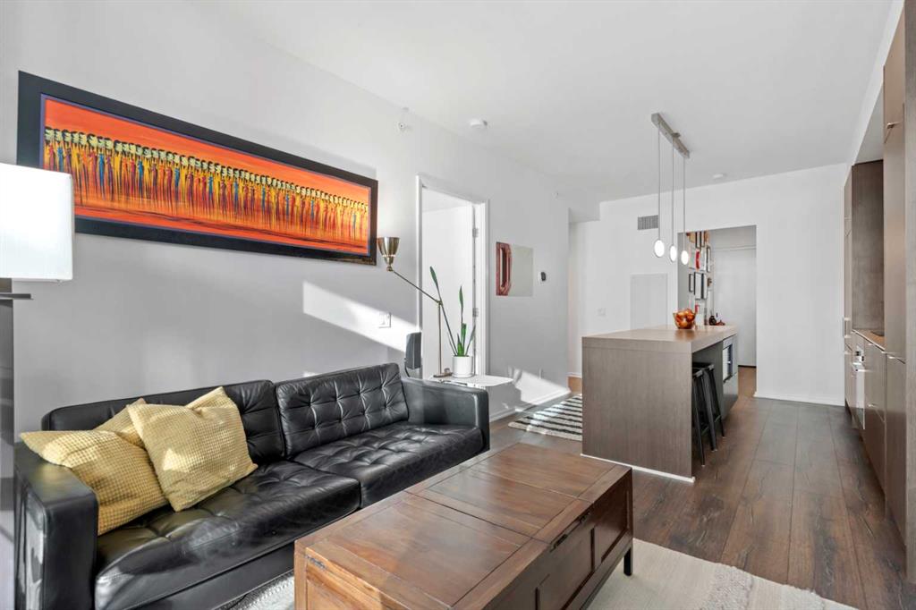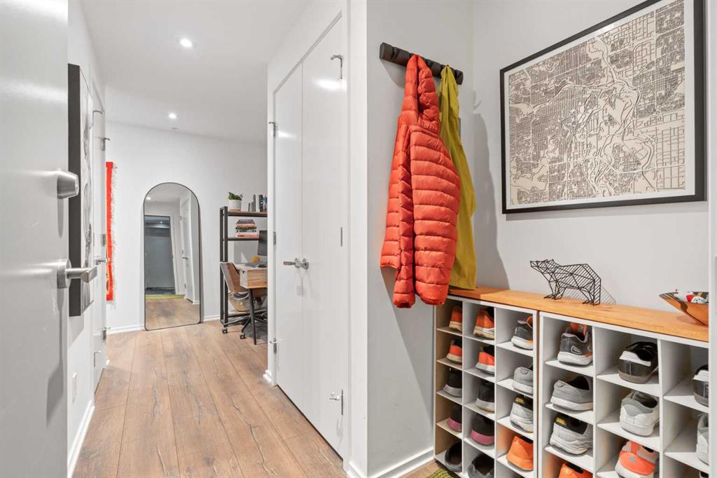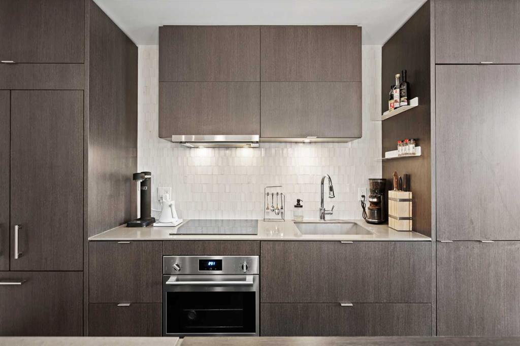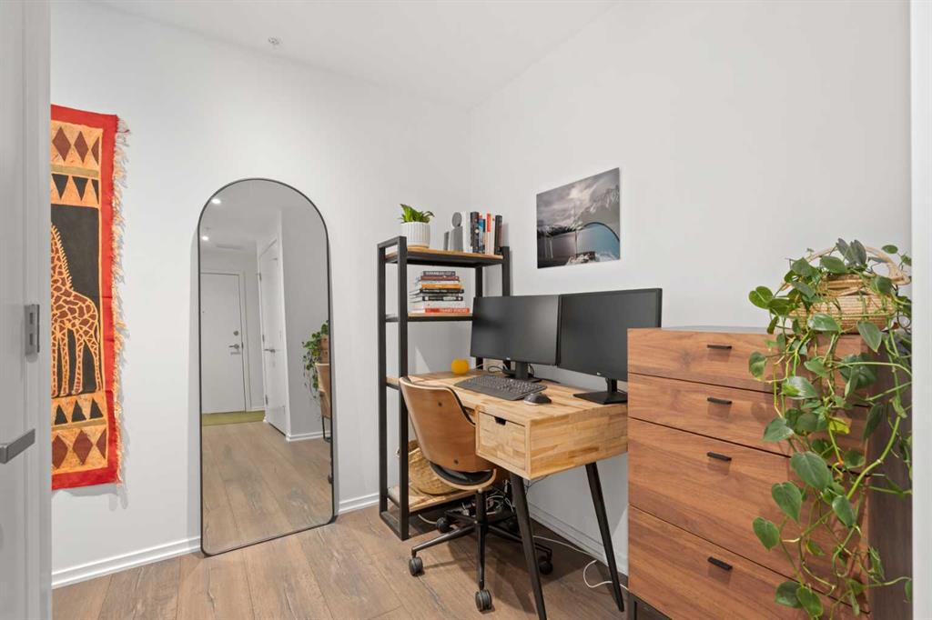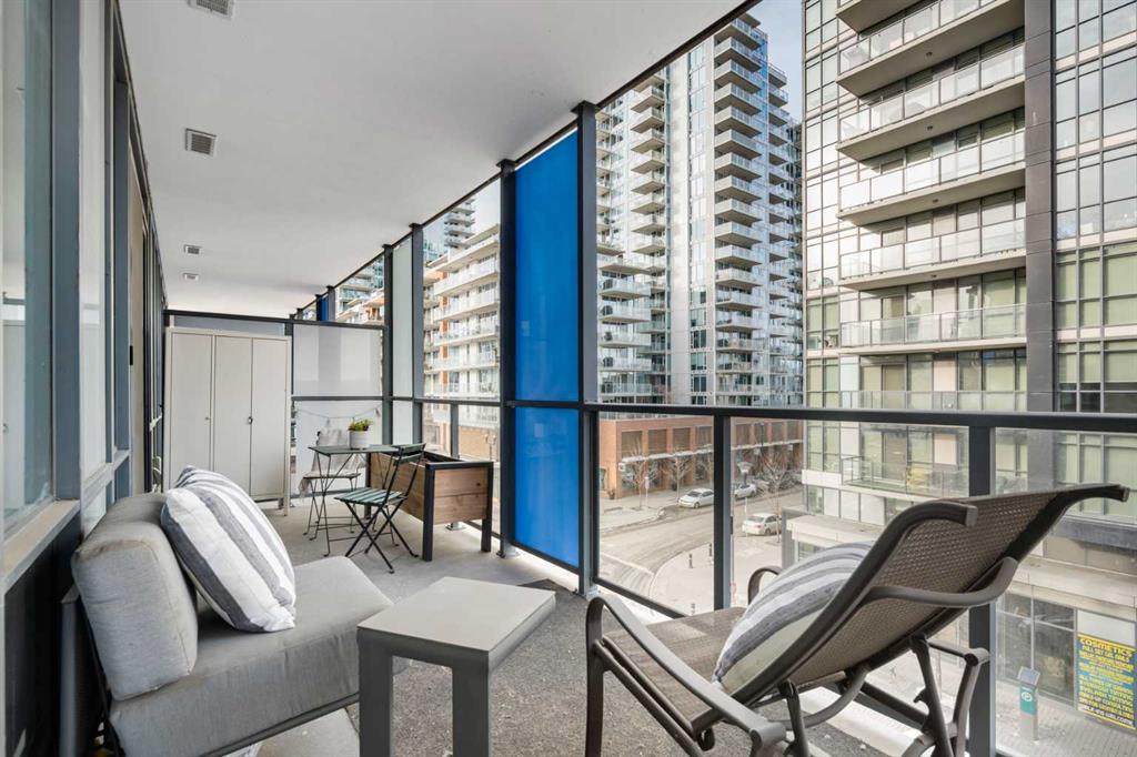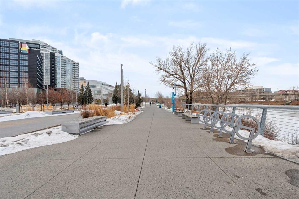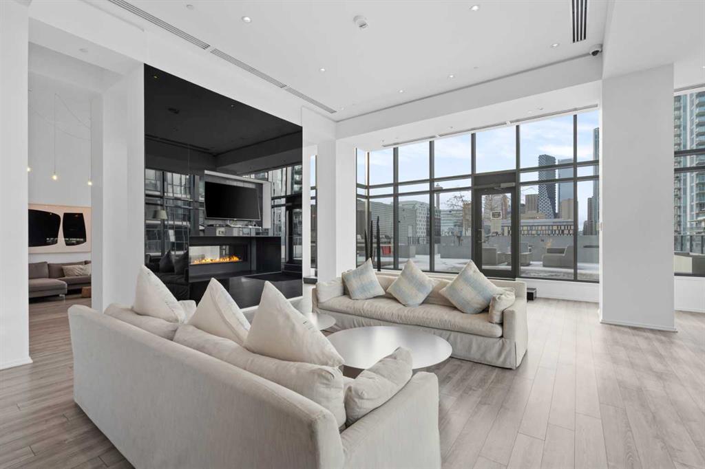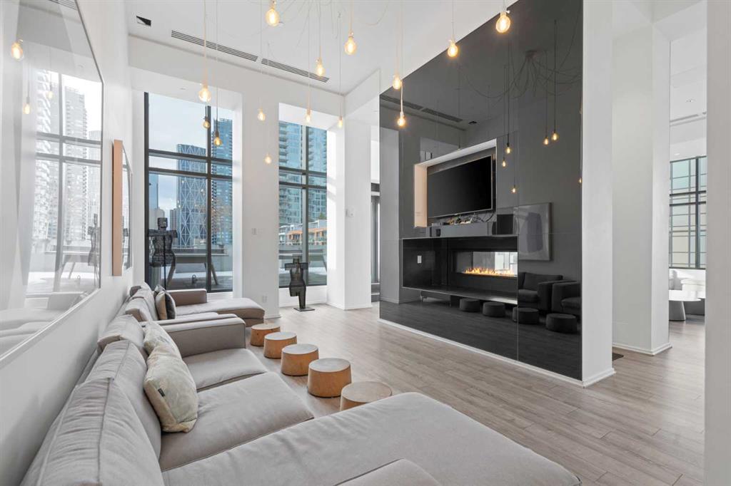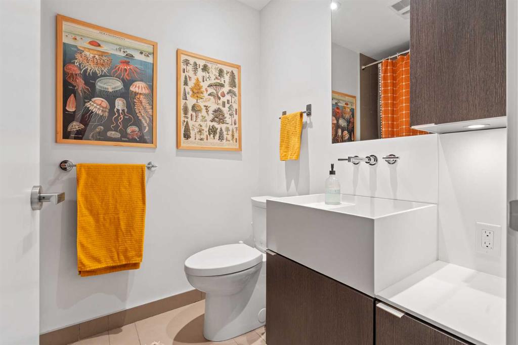 Welcome to Verve – a high quality building by FRAM and Slokker, offering unmatched value and an array of top-notch building amenities. This immaculate 2 bedroom, 2 full bathroom condo offers an ideal floorplan, with flexibility to have multiple work-from-home spaces or easily accommodate having a roommate. Designed by the award winning international designer, Cecconi Simone, the floorplan is flawless, being very functional and efficient with clean and modern finishes. Upon entering the unit, you are greeted by a spacious foyer with room for a bench or shoe rack as well as a full-sized front closet. Further down the entry way, there is the perfect nook for an office desk or additional storage. The European-styled kitchen features sleek cabinetry, built-in appliances, custom-designed pendant lighting and a smart eat-in island that fits four. The kitchen is fitted with quartz countertops, a stainless steel under-mount sink with a pull-out faucet, mosaic tiled backsplash and under-cabinet led lighting. With bedrooms and bathrooms on opposite sides, privacy is maximized. The closets have been finished with custom closet organizers, providing plenty of storage. The modern bathrooms come with custom cabinetry, beautiful lighting, a luxurious soaker tub and a spacious shower with a glass enclosure. Floor to ceiling windows span the living room which opens up to an oversized balcony, encompassing a seamless blend of indoor/outdoor enjoyment. The unit is completed with in-suite laundry, a spacious titled parking stall and a storage locker. Residents of Verve enjoy full-time concierge services, a boutique hotel-feel lobby, plenty of visitor parking stalls and multiple secured bike rooms. Upscale amenities include a fully equipped gym and the sixth-floor lounge with a kitchen, comfy couches, fireplace, original artwork and outdoor terrace. The 25th floor rooftop patio is stunning, providing the perfect spot for taking in the city’s incredible views. East Village is one of Calgary’s most vibrant and walkable neighbourhoods – steps to river pathways, parks, St. Patrick’s Island, grocery stores, cafes at your doorsteps and delicious restaurants right around the corner. Take advantage of the easy commuting with the close c-train in the free-fare downtown zone. Fall in love with East Village and begin your next chapter here.