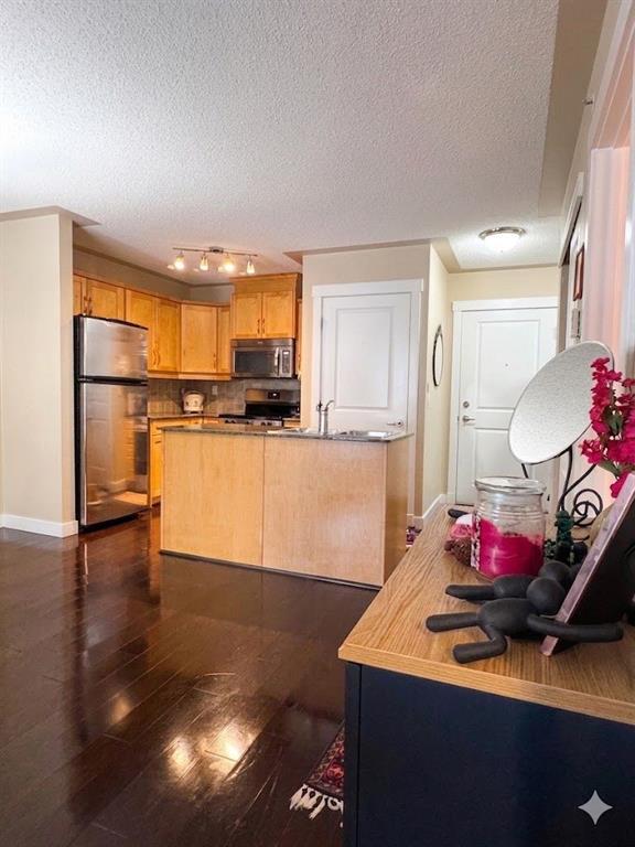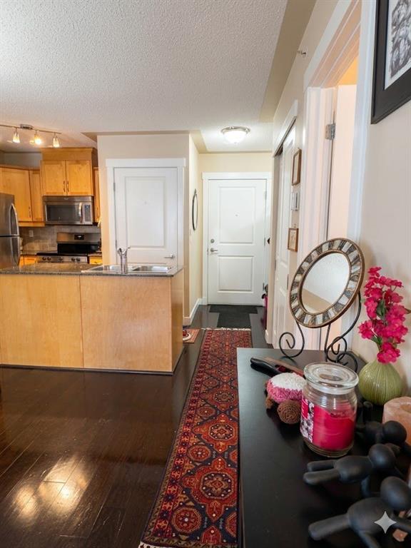 Welcome to the Gateway Garrison Woods in the highly sought-after community of Marda Loop. Discover this well-cared-for 3rd floor condo featuring hardwood flooring, a sunny east-facing balcony and a titled underground parking, Thoughtfully designed, the one-bedroom plus den layout offers a bright, functional space that is truly move-in ready. The kitchen is both stylish and practical, complete with generous cabinet space, granite countertops, and stainless-steel appliances, flowing effortlessly into the dining area. Natural light fills the living room, creating a warm and comfortable atmosphere, while patio doors lead to your private balcony—perfect for relaxing or grilling with the convenience of a built-in gas line. Near the entrance, a versatile flex space provides the ideal spot for a home office, reading nook, or additional storage. In-suite laundry adds everyday convenience. IDEALLY SITUATED IN A PREMIUM LOCATION within the building, this unit is just STEPS AWAY FROM THE ELEVATOR offering quick direct access to the underground parkade, all within a quiet low traffic setting. Enjoy the benefits of a well-managed, pet-friendly building (subject to condo approval) that includes underground visitor parking, secure bike storage, and a third-floor Owner’s Lounge with an expansive outdoor balcony for your enjoyment. Condo fees are reasonable and cover all utilities, including gas, electricity, water, and sewer. Unbeatable walkability—enjoy cafes, dining, groceries, banking, and everyday essentials just steps from your door in this vibrant, trendy neighbourhood.