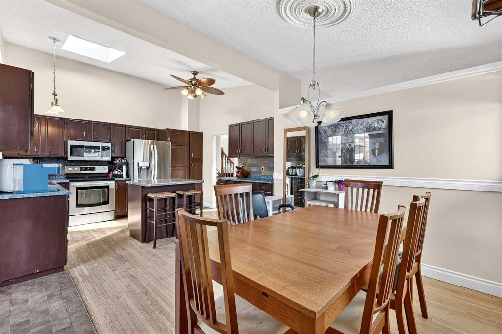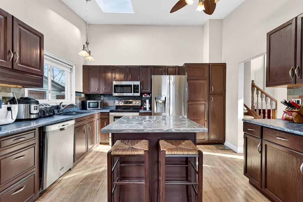 Amazing potential in Willow Park. This well-loved mid-century style four level split offers an excellent opportunity for a renovation that reflects your own style. The front veranda welcomes you into a spacious living room with A-frame vaulted ceilings and hardwood floors. The kitchen features a vaulted ceiling with a skylight, classic cabinetry, generous counter and storage space, and a spacious dining area that opens to the backyard.