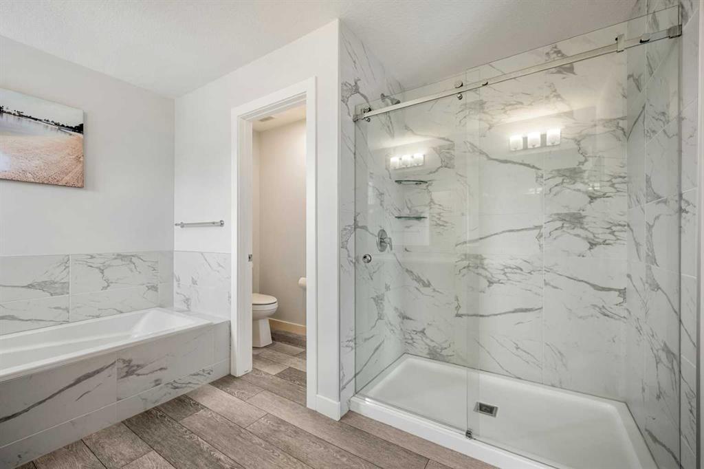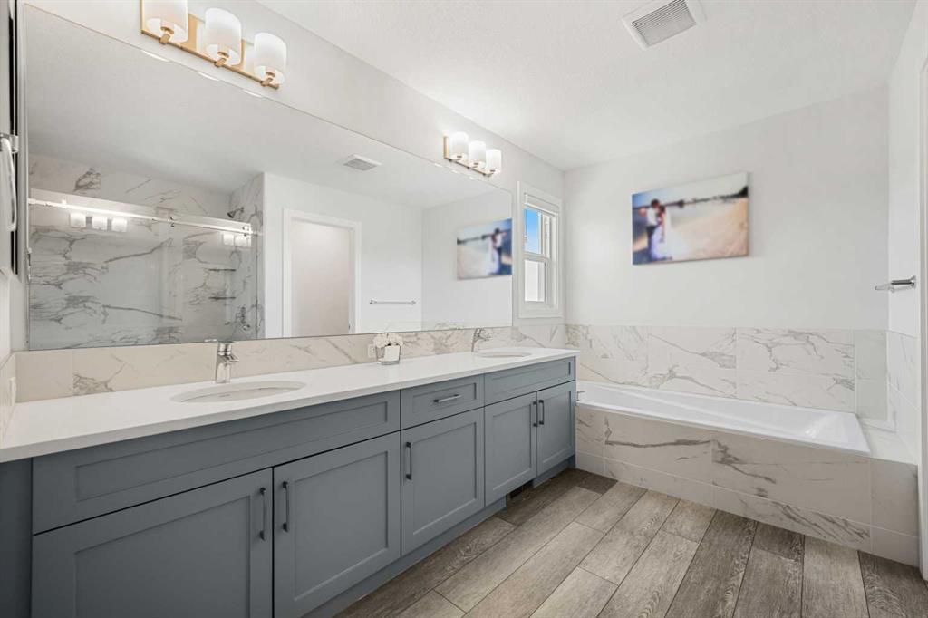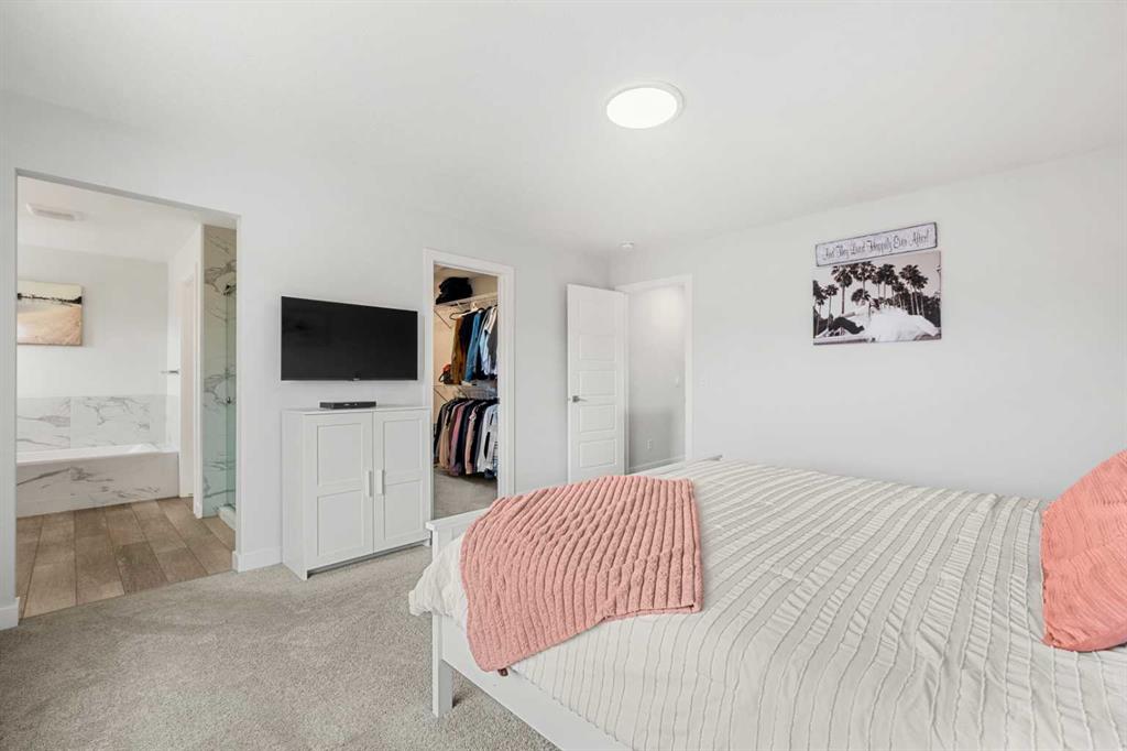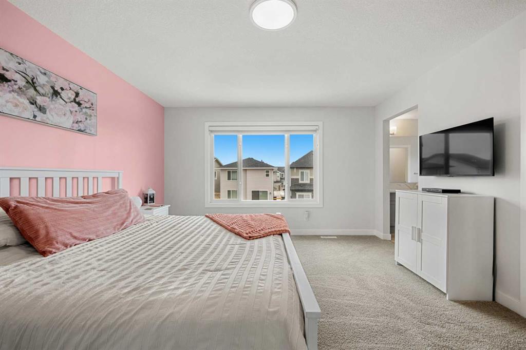 Upstairs, you’ll find an exceptional layout with four spacious bedrooms, including a stunning primary retreat featuring a luxurious 5-piece ensuite with dual vanities, a soaker tub, glass shower, and a walk-in closet. A second full bathroom, upper-level laundry, and a generous bonus/family room provide added comfort and flexibility for growing families.