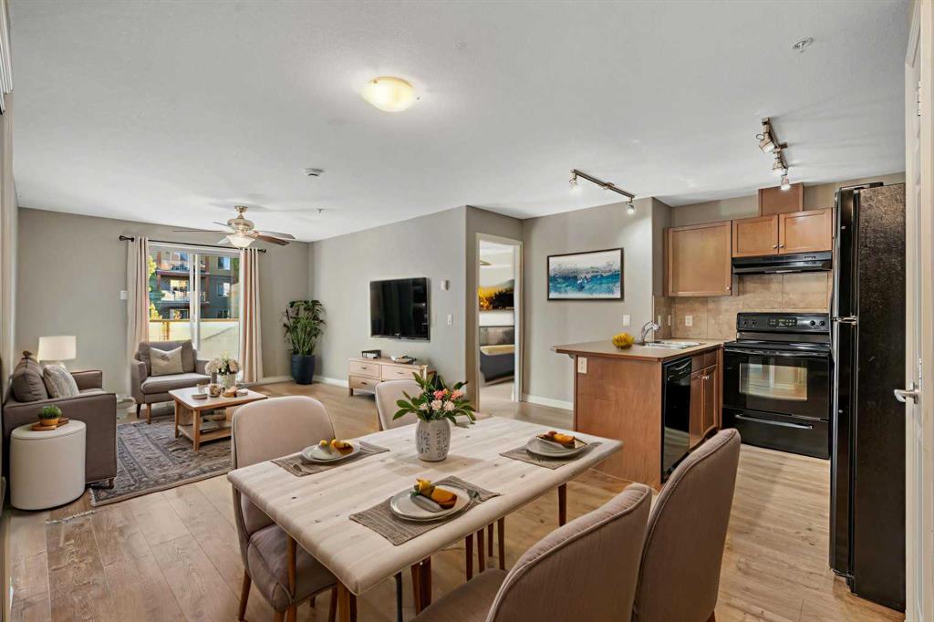LAKE ACCESS | RESORT-STYLE AMENITIES | TWO PARKING STALLS | MOVE-IN READY | 2 BED/BATH + DEN | Welcome to the Mesa condos in Crystal Shores, where low-maintenance living meets year-round lake access and resort-style amenities. This beautifully updated second-floor end unit offers 908 square feet of thoughtfully designed living space with a bright, open layout and plenty of natural light throughout. This ideal floorplan was created for both privacy and functionality, featuring two spacious bedrooms, two full bathrooms, a den, and in-suite laundry — making it an excellent fit for almost anyone. The kitchen offers ample counter space with loads of cabinetry, a large pantry, sleek black appliances, and a sizable breakfast bar. The open layout allows plenty of room for large living room furniture and a full-sized dining set. A convenient den or flex space nearby makes an ideal home office or reading nook, while the dining and living area flows seamlessly onto a large covered balcony with a gas BBQ hookup, perfect for enjoying a morning coffee or glass of wine. The large primary suite features a walk-through closet, a private 4-piece ensuite, and a large east-facing window. The second bedroom is equally generous and has access to a full bathroom and ample closet space. Additional features include updated lighting, two linen closets, and window coverings throughout. All flooring was replaced in 2023 with luxury vinyl plank, and the home has been very well maintained since, offering a truly move-in-ready experience. This unit comes with two titled parking stalls: one surface stall just steps from the entrance and one heated underground stall that includes an adjacent storage cage. Living at Mesa means enjoying more than just your home — it’s a lifestyle. Residents have access to a private fitness centre, hot tub, sauna, games room with a pool table, and a large social space with a kitchen for hosting gatherings, as well as an on-site car wash bay. As part of the Crystal Shores community, you’ll also enjoy exclusive lake privileges with swimming, paddleboarding, beach volleyball, skating in the winter and a community golf course. Perfectly situated on the north side of Okotoks, this location offers quick access to Calgary while providing the peaceful, lakeside atmosphere that makes Crystal Shores one of the most desirable communities in town. Book your private showing today!