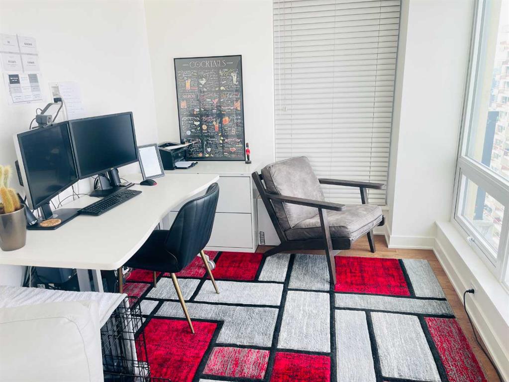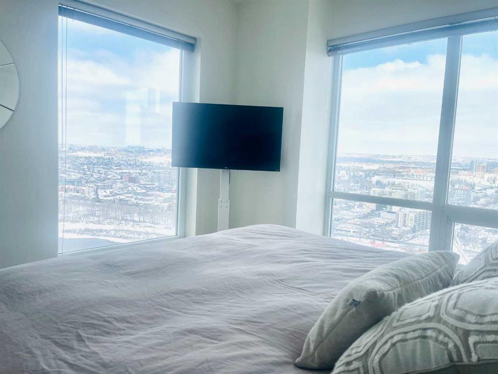 Experience luxury living high above Calgary in this premier NW corner suite on the 32nd floor, offering 1,017 sq.ft. of beautifully designed space with 2 bedrooms, 2 bathrooms + den. High ceilings and oversized windows bring the outside in, filling the home with natural light and framing spectacular 180° unobstructed views of the Bow River, Rocky Mountains, Kensington, downtown, and even the airport. This rare floorplan is one of only three units of its kind in the building, making it an exceptional opportunity.