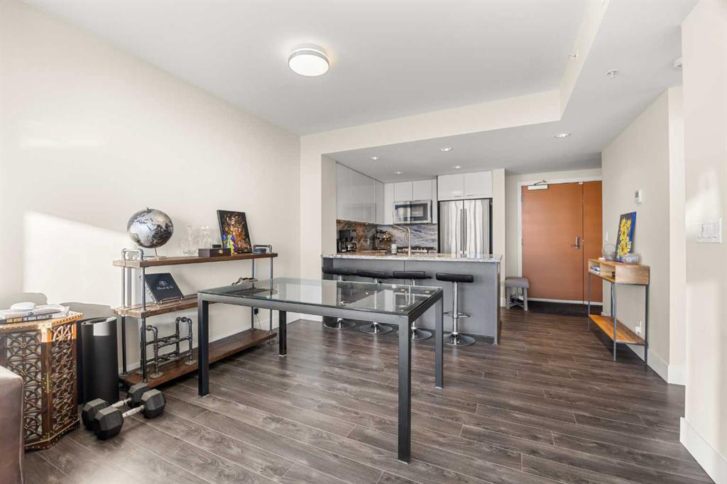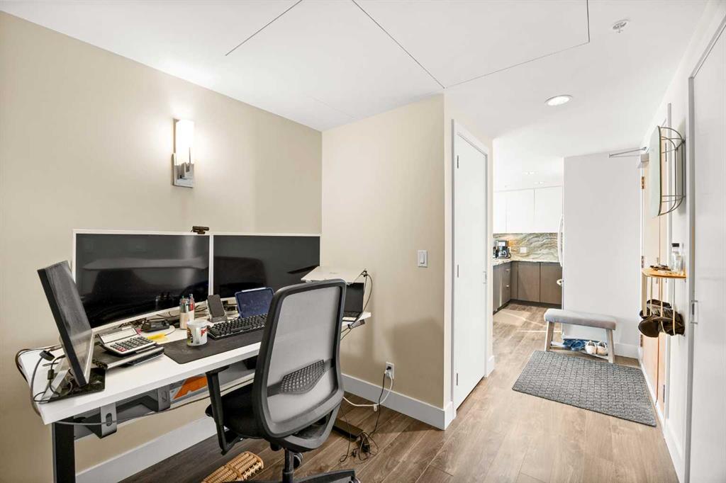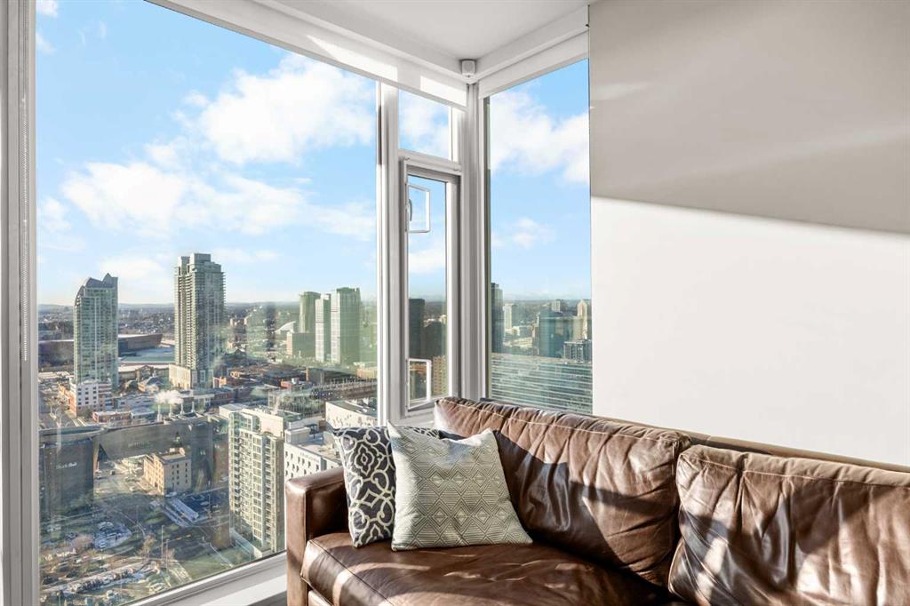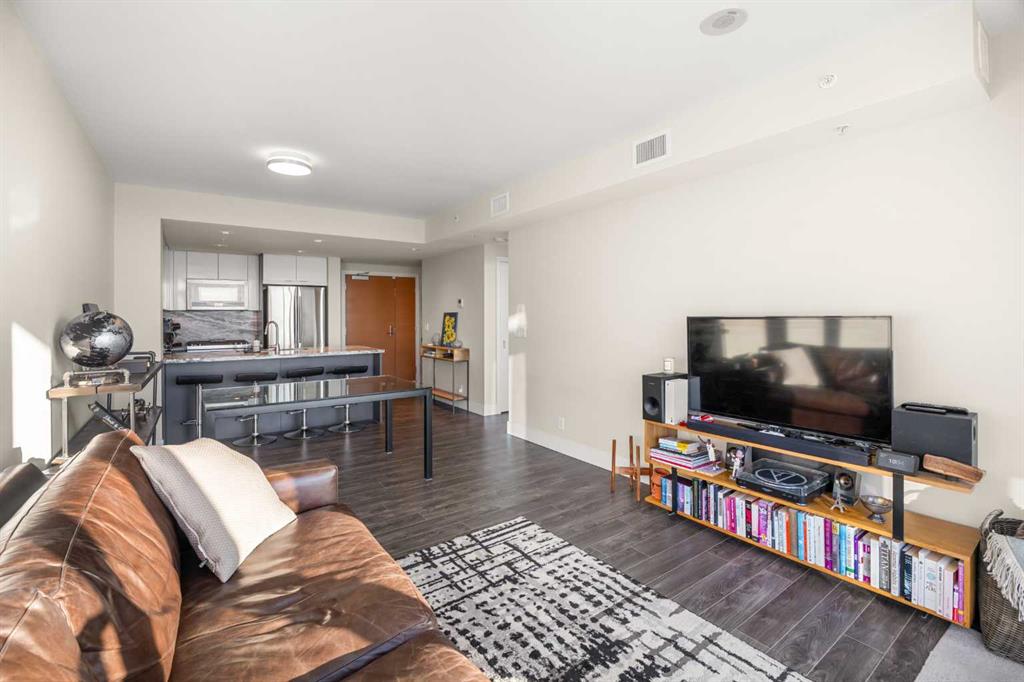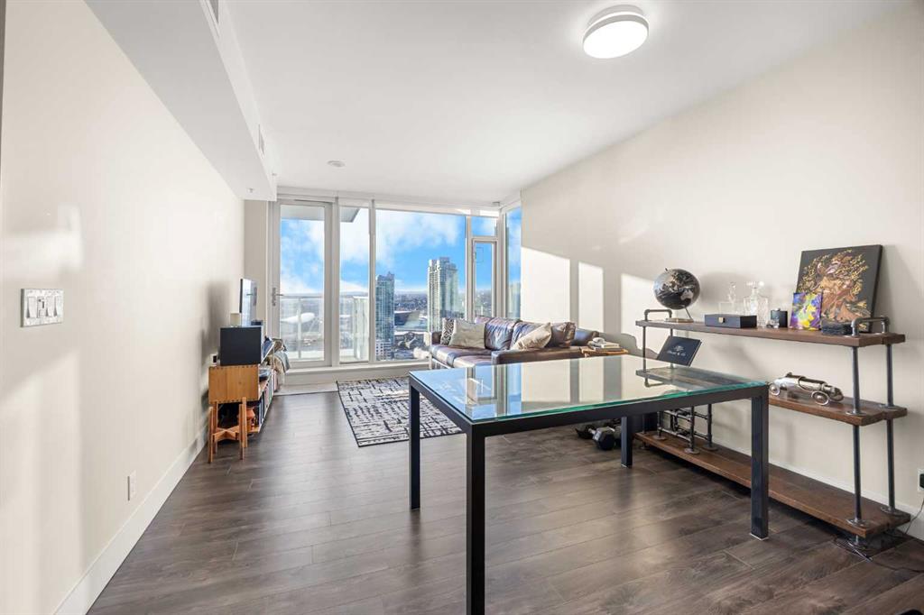 WOW! Perched on the TOP floor, this stunning 1 Bedroom + Den condo offers unobstructed south-facing views of the Calgary Tower, downtown skyline, and Bow River—a truly breathtaking urban panorama. Step inside to luxury vinyl plank flooring throughout and a functional Den immediately on your left, ideal for a home office or study space, before the layout opens into a bright open-concept Living, Dining, and Kitchen area.