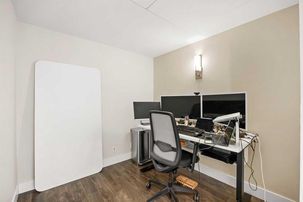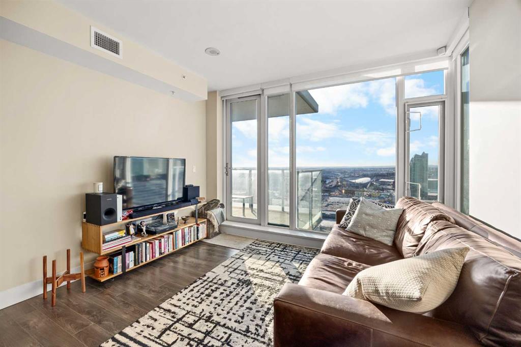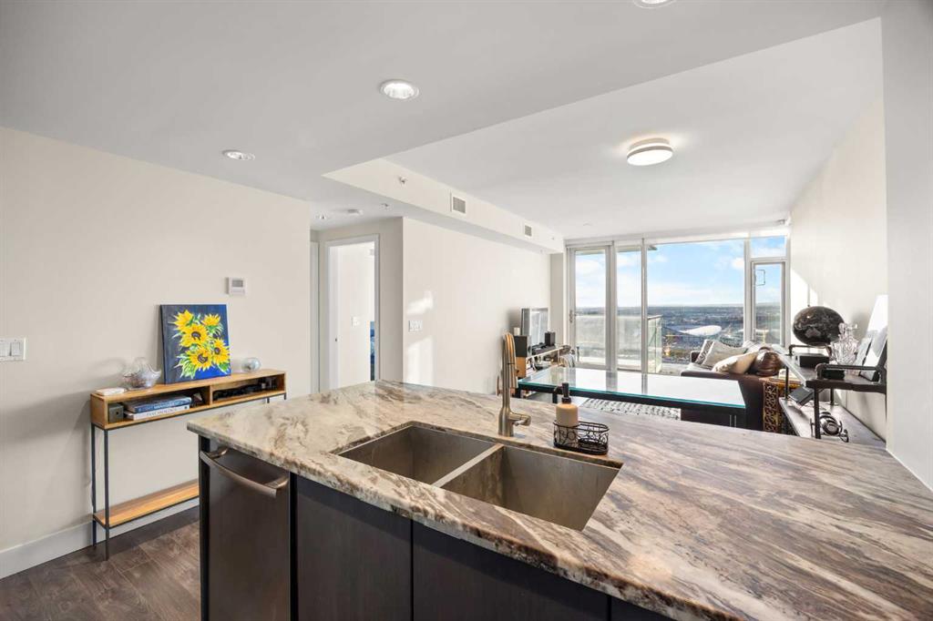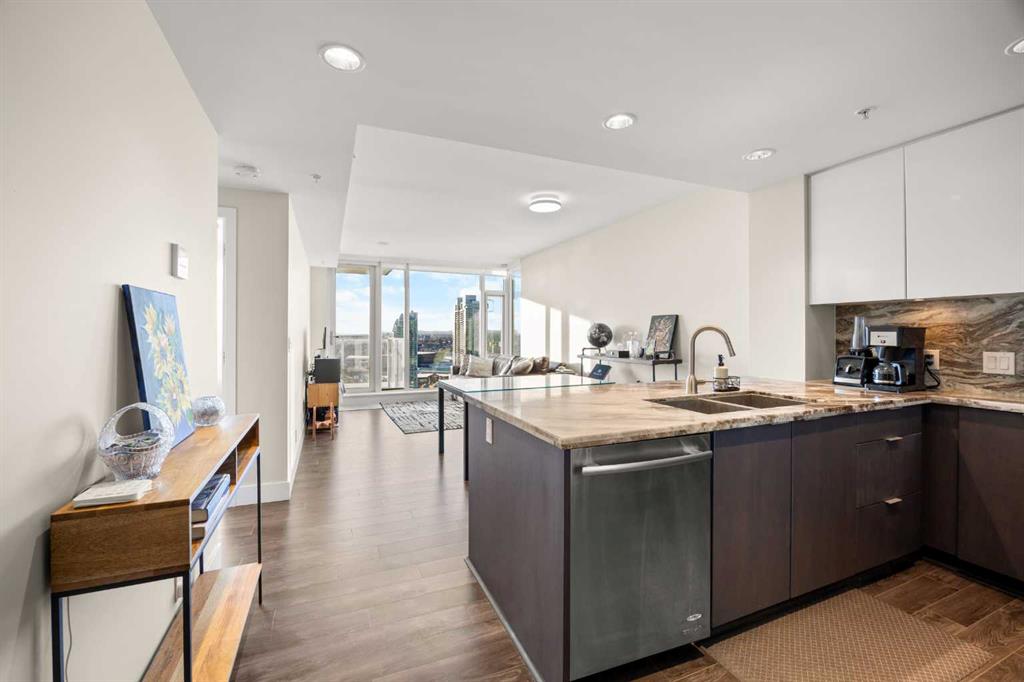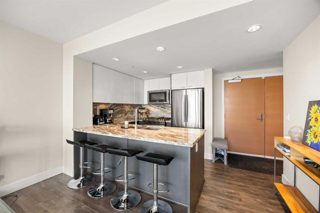 WOW! Perched on the TOP floor, this stunning 1 Bedroom + Den condo offers unobstructed south-facing views of the Calgary Tower, downtown skyline, and Bow River—a truly breathtaking urban panorama. Step inside to luxury vinyl plank flooring throughout and a functional Den immediately on your left, ideal for a home office or study space, before the layout opens into a bright open-concept Living, Dining, and Kitchen area.