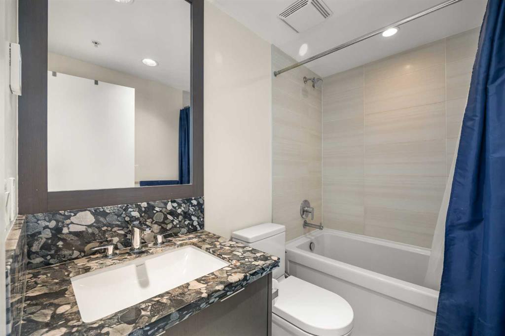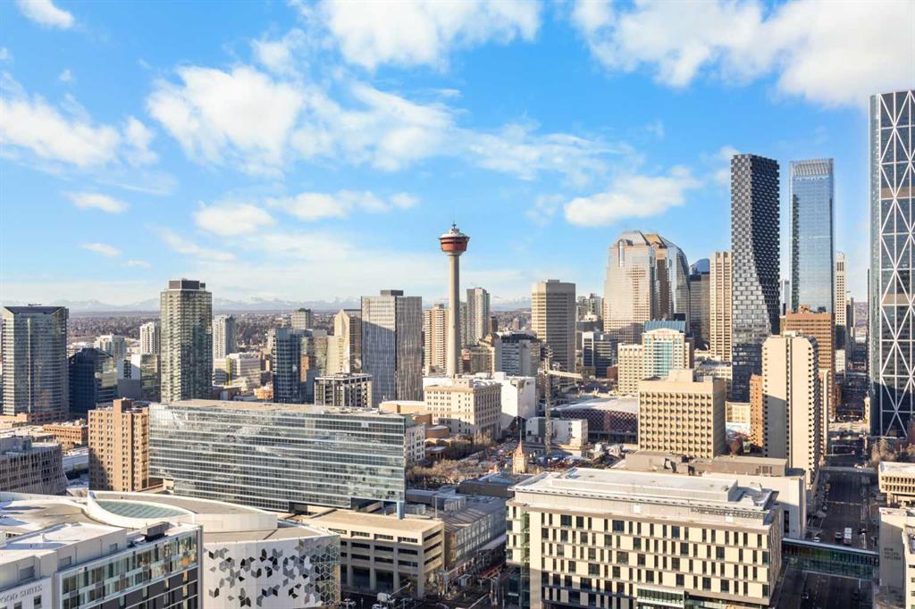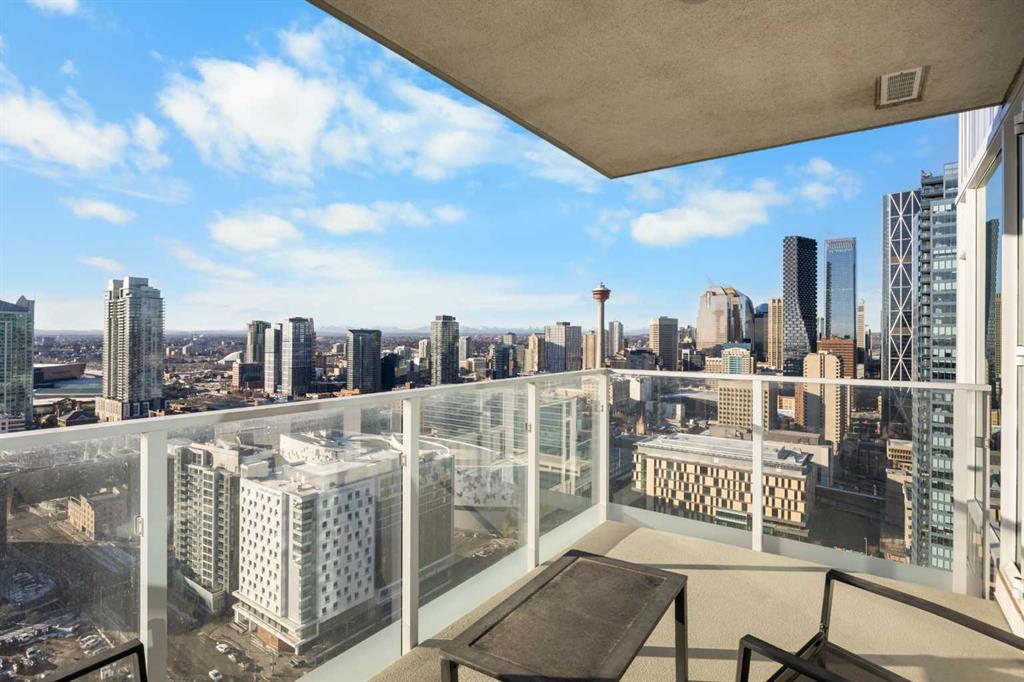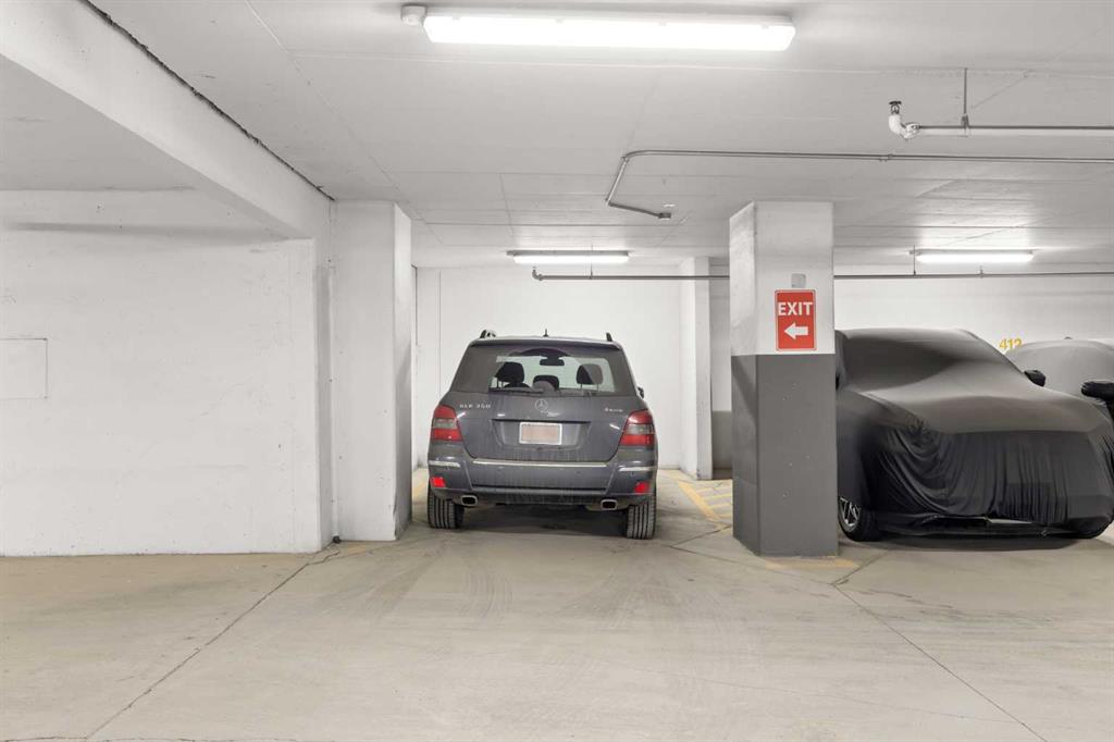 The Primary Bedroom is well sized and also enjoys the same stunning south-facing views through its full-height windows, with a patio door providing direct access to the balcony—creating the perfect backdrop to unwind and enjoy iconic downtown and Calgary Tower views. A 4-piece Bathroom features granite countertops, and in-suite laundry is thoughtfully located near the bedroom for added functionality. This condo includes 2 underground parking stalls conveniently located near the elevator, both being end stalls for extra space and easy access, as well as 1 storage locker for added convenience.