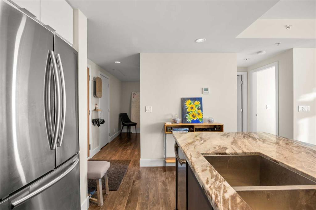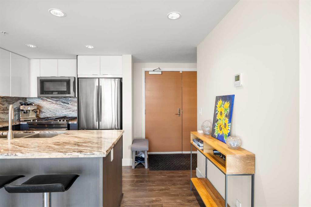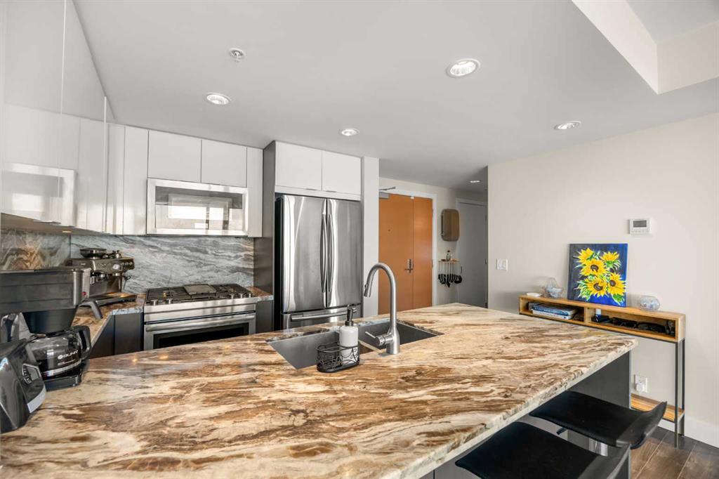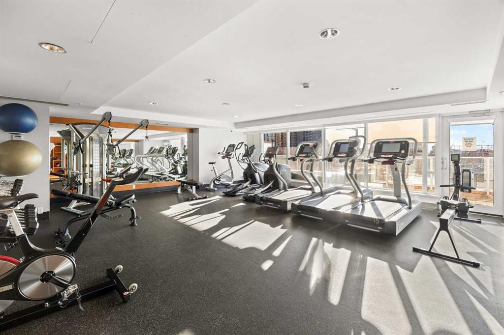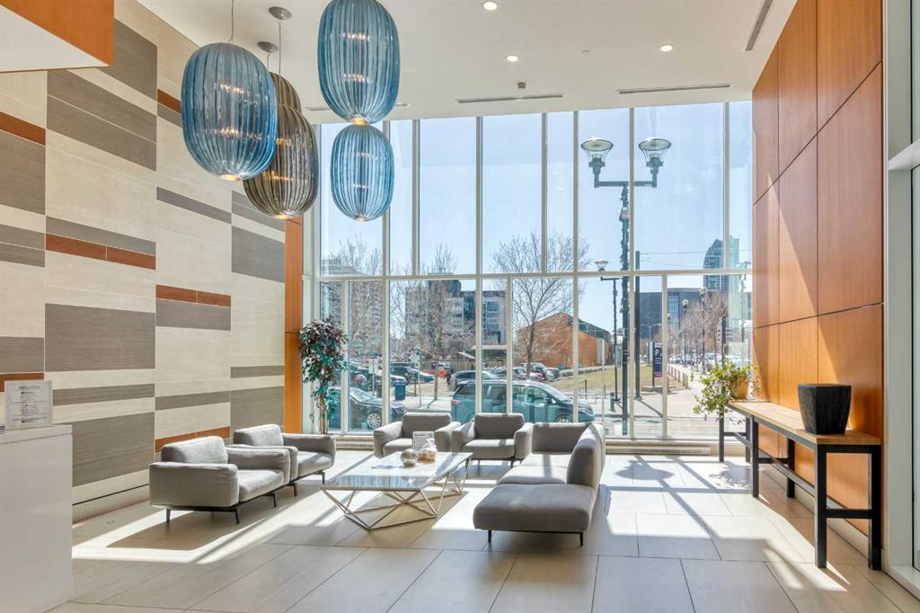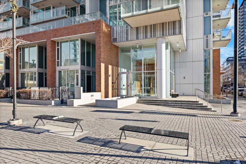 Residents enjoy access to premium building amenities, including a fitness centre, party room with kitchen, sauna, steam room, outdoor patio with BBQ area, and fire pit, along with concierge service in the front lobby for added security and package handling. Located within walking distance to Superstore, Riverwalk along the Bow River, Riverfront Pathways, Prince’s Island Park, YMCA, C-Train, shopping, and an array of dining options, this home delivers elevated downtown living at its finest.